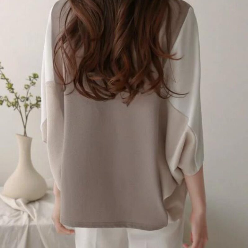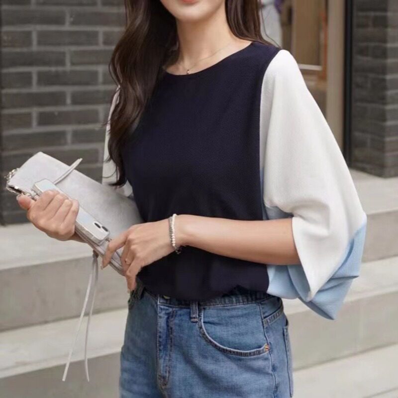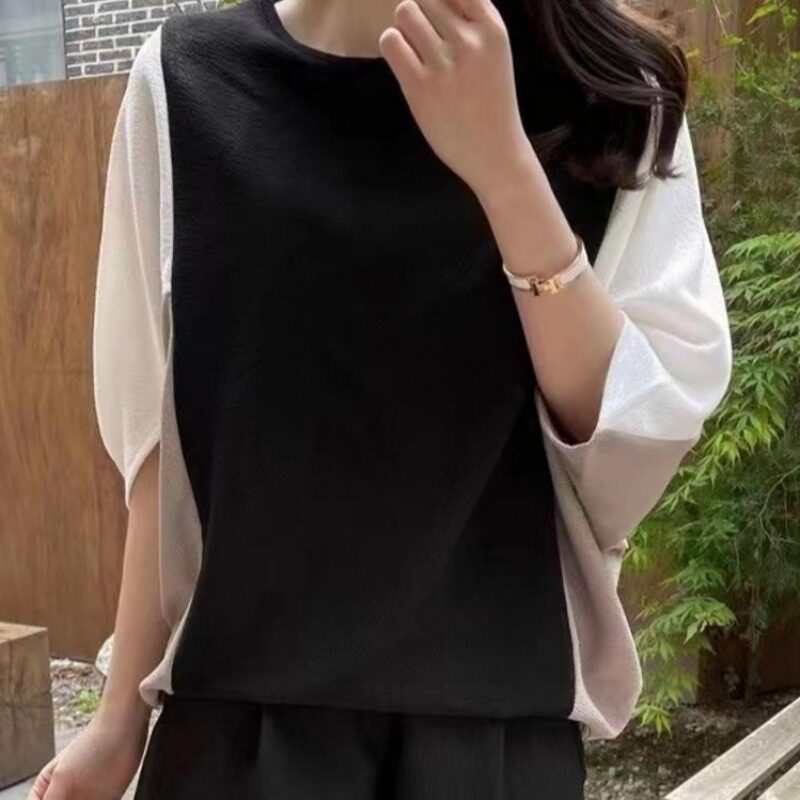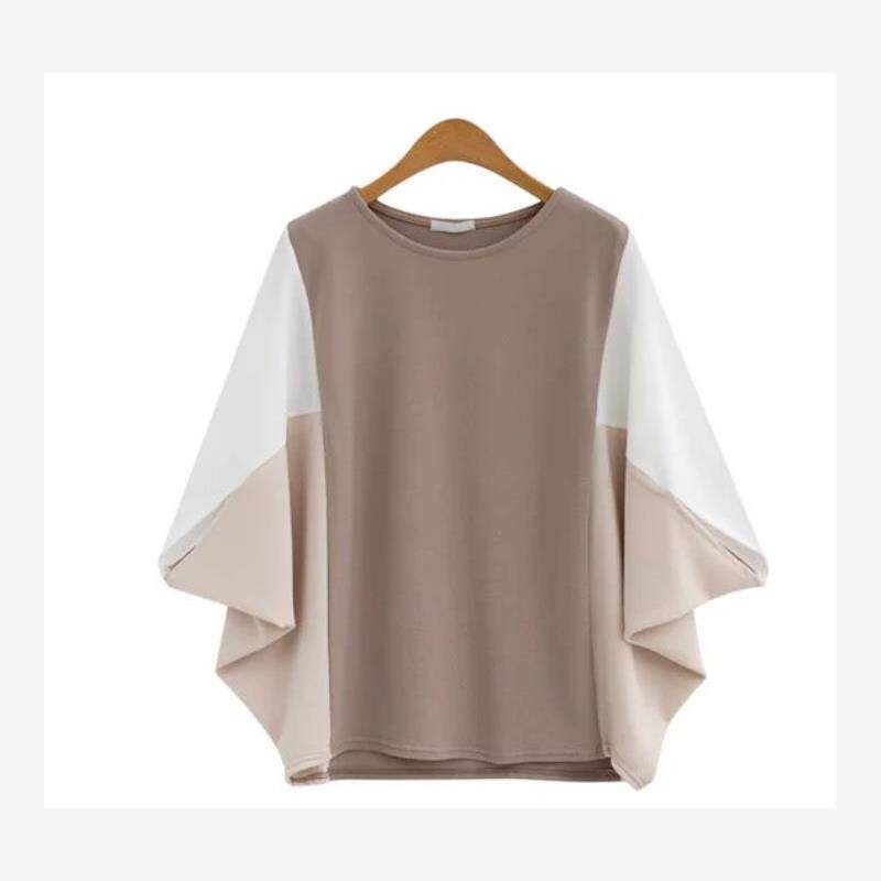 跨境韩版港味时尚夏季新品圆领拼接宽松遮肚子简约蝙蝠袖休闲 �