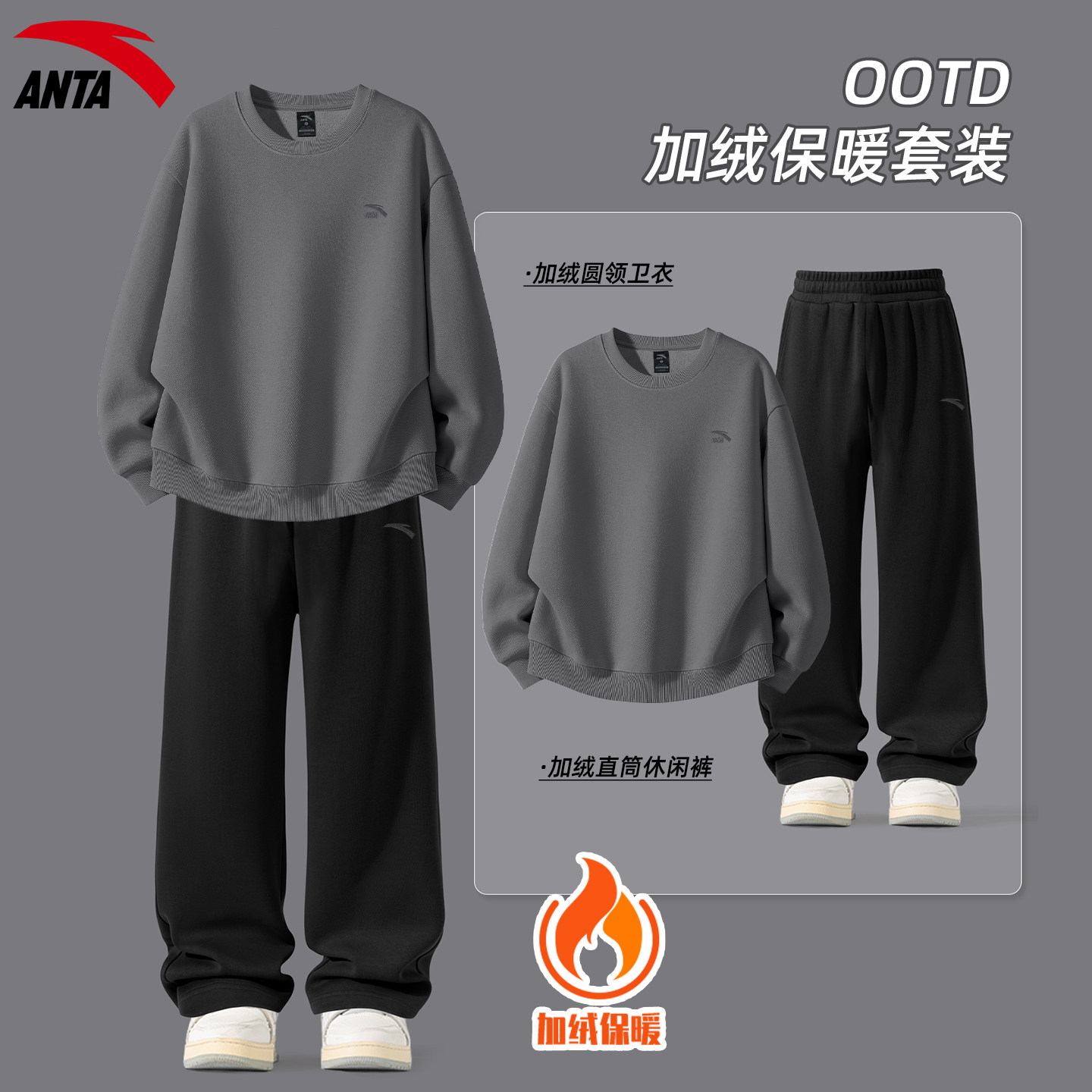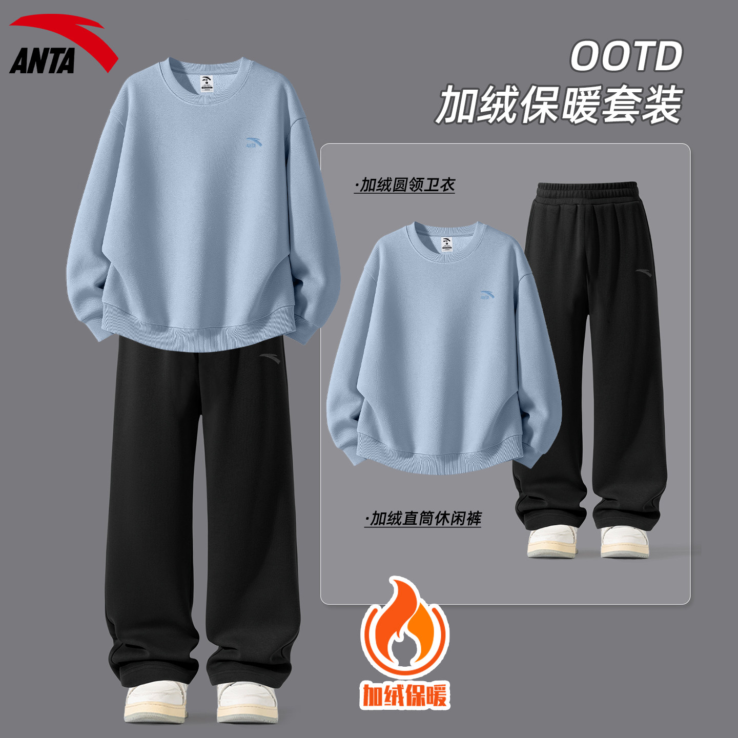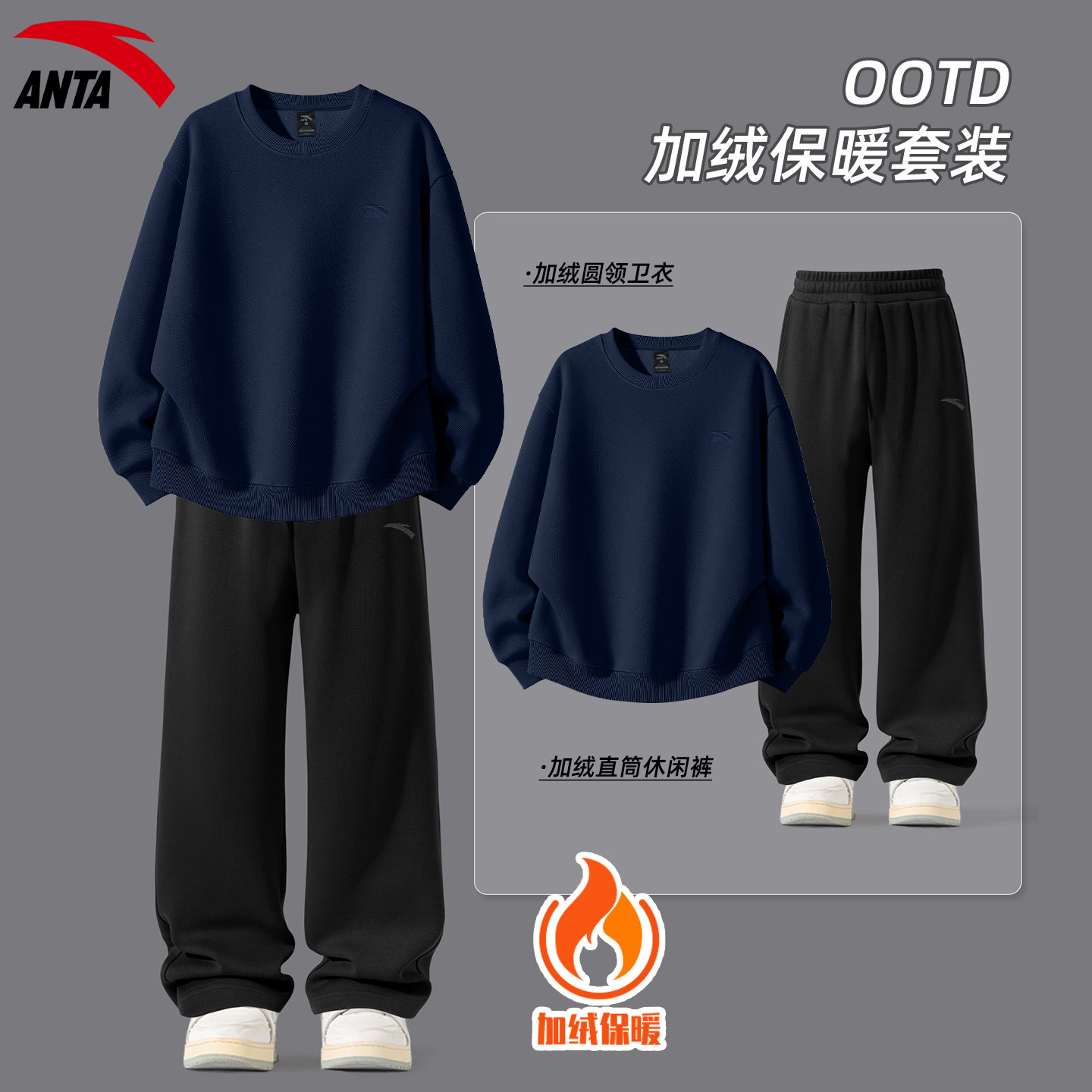 安踏运动套装男装加绒保暖卫衣卫裤休闲学生青少年冬季新款两件套