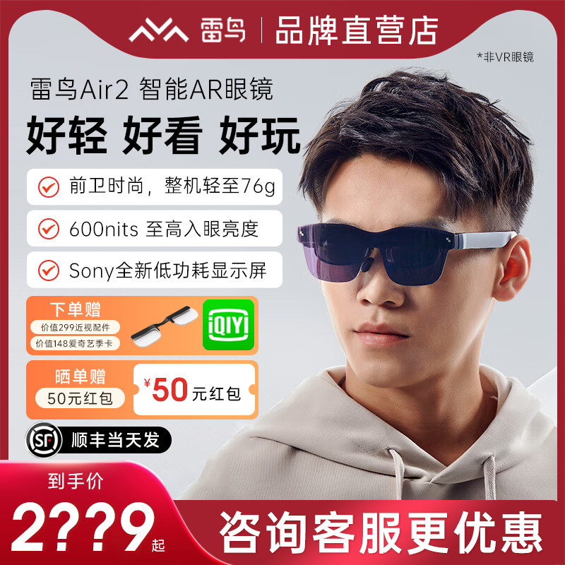 雷鸟Air2智能AR眼镜3D虚拟215英寸高清巨幕观影Air Plus眼镜游戏黑科技头戴显示器便携配镜苹果手机电脑投屏