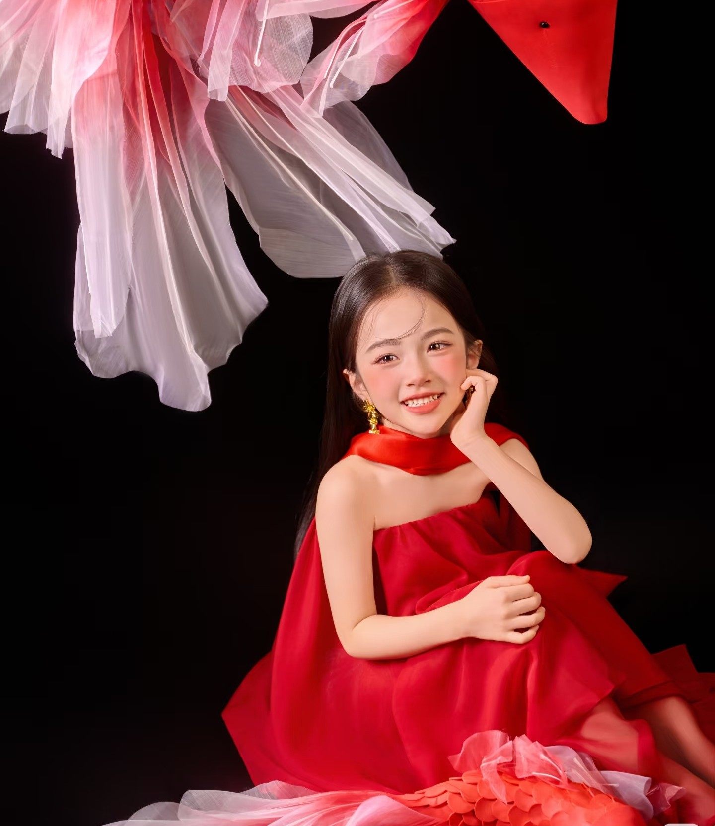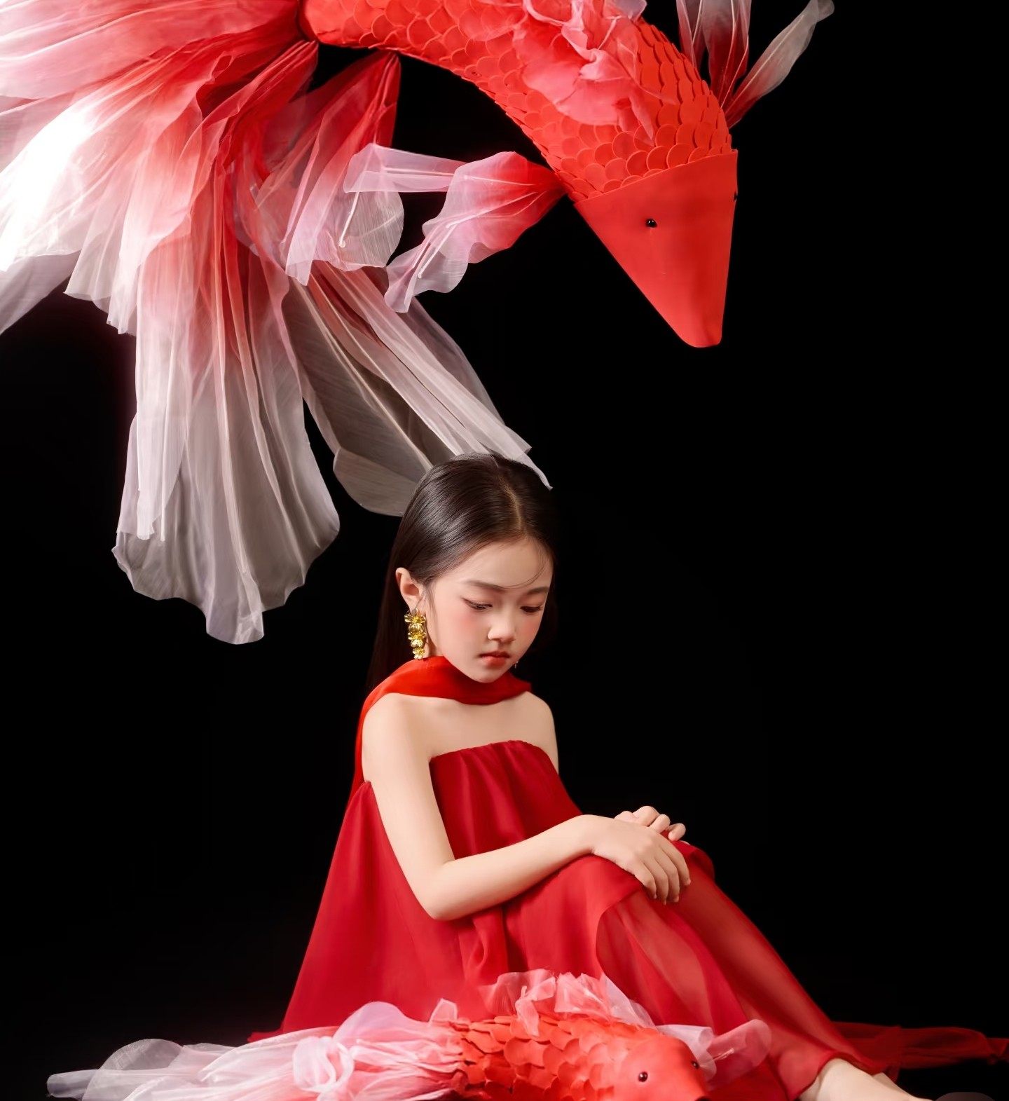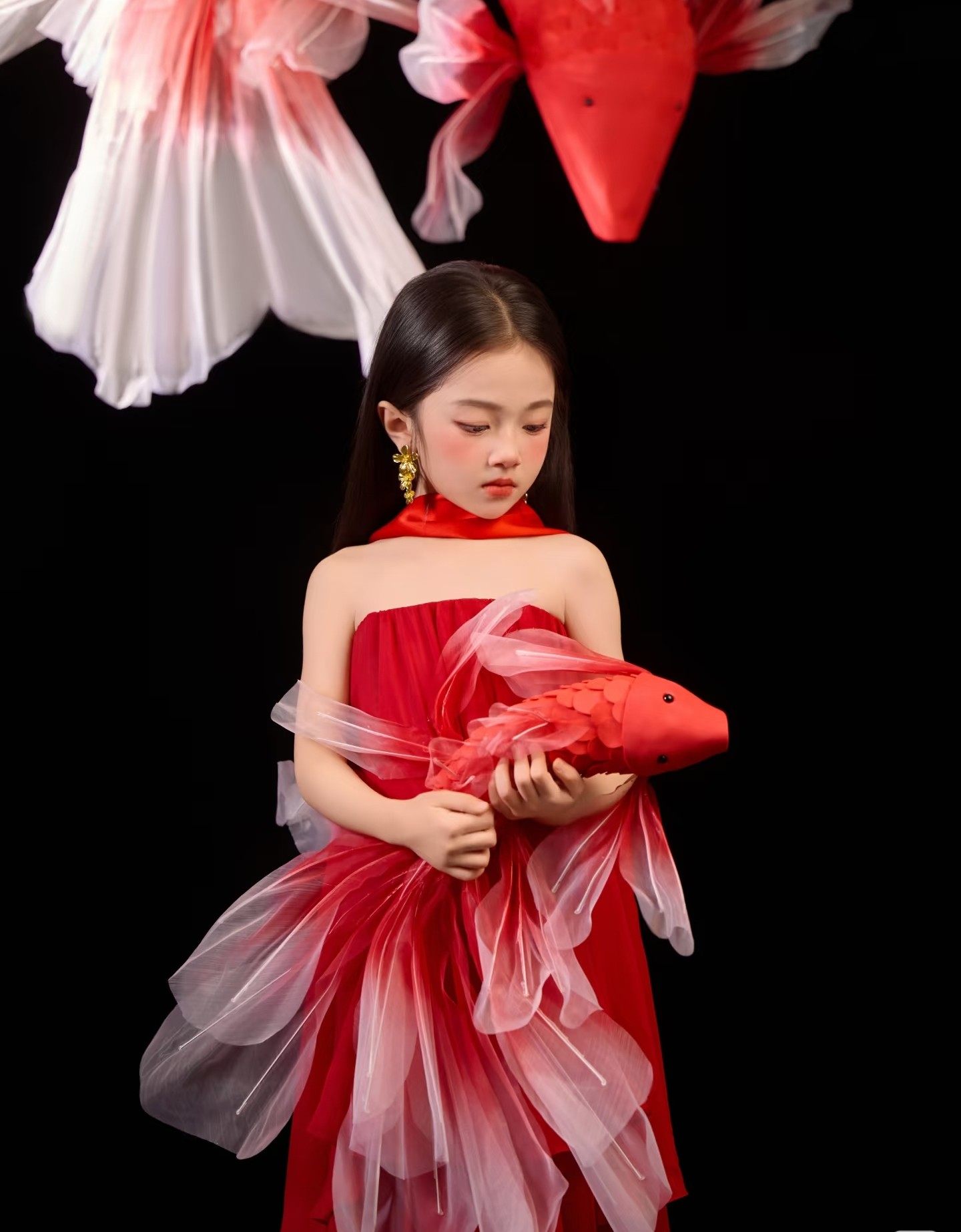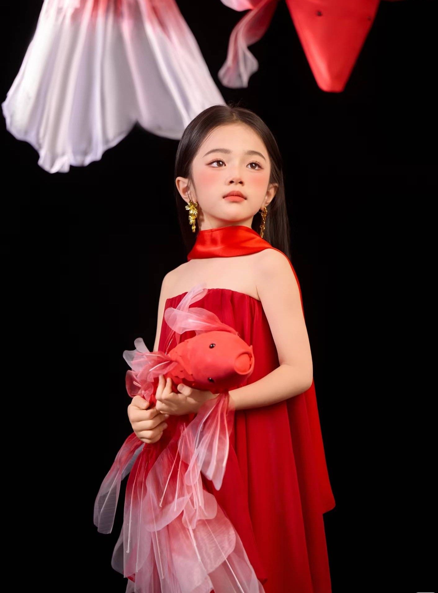 影楼亲子主题新中式红色锦鲤挂脖飘纱礼服复古国风艺术照摄影服装