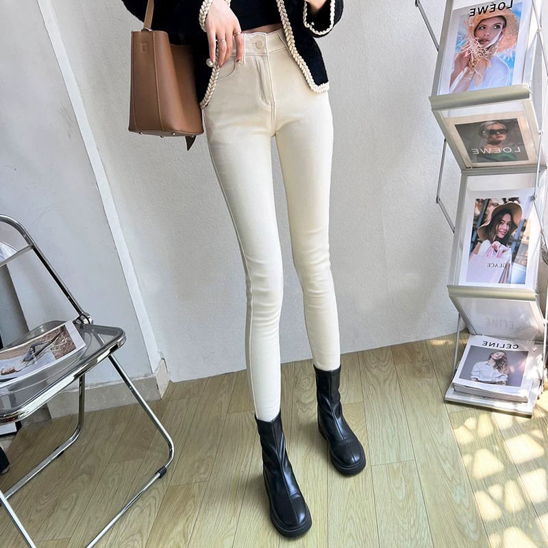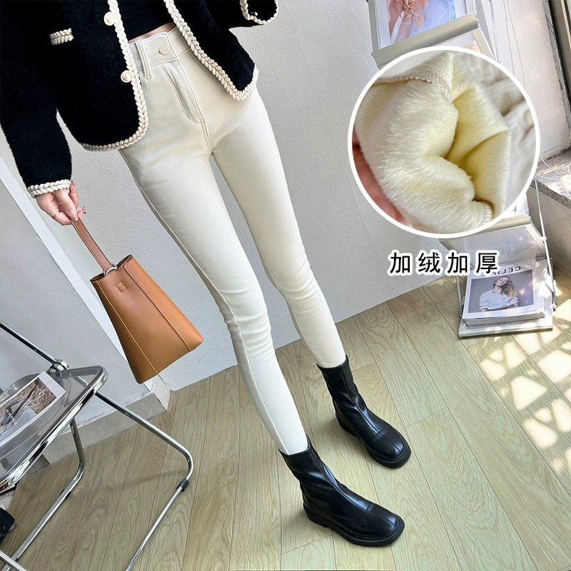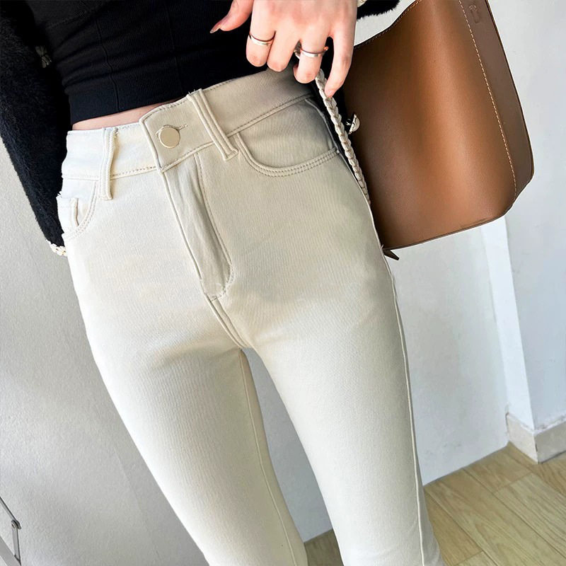 女士2025秋冬新款牛仔裤白色高腰显瘦小个子加绒保暖小脚铅笔裤子