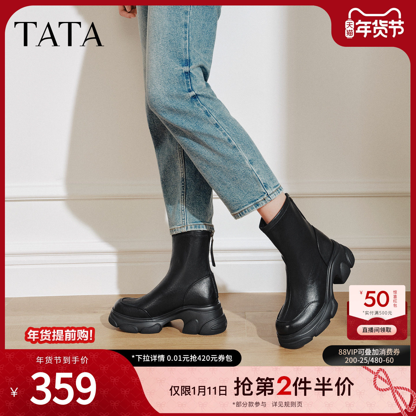 TATA他她喵爪靴2025冬季新款加绒时装靴女瘦瘦短靴弹力靴CEG07DZ5
