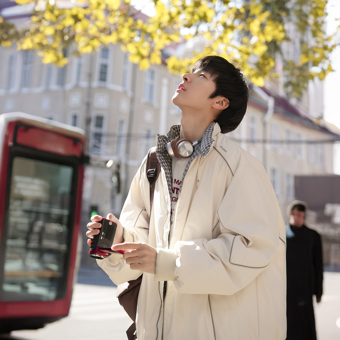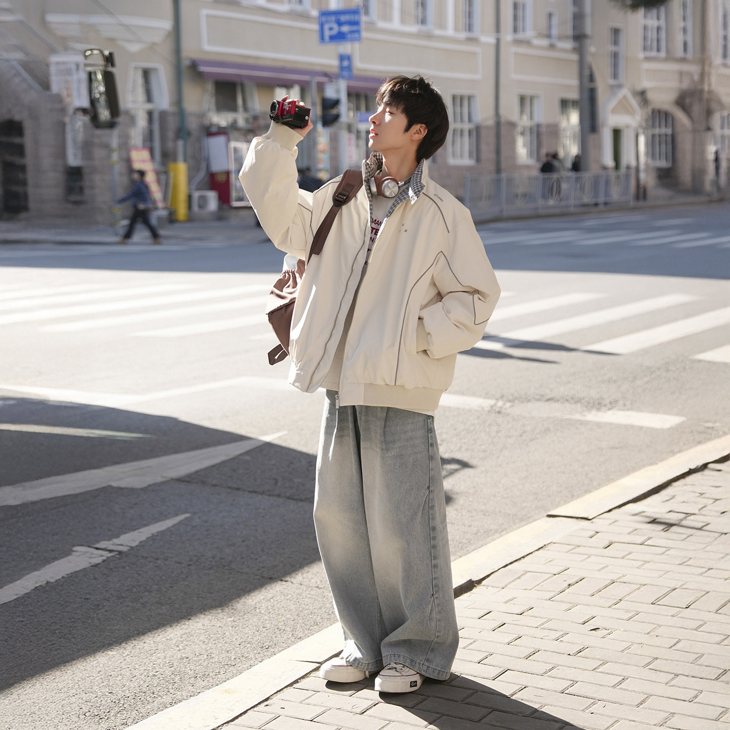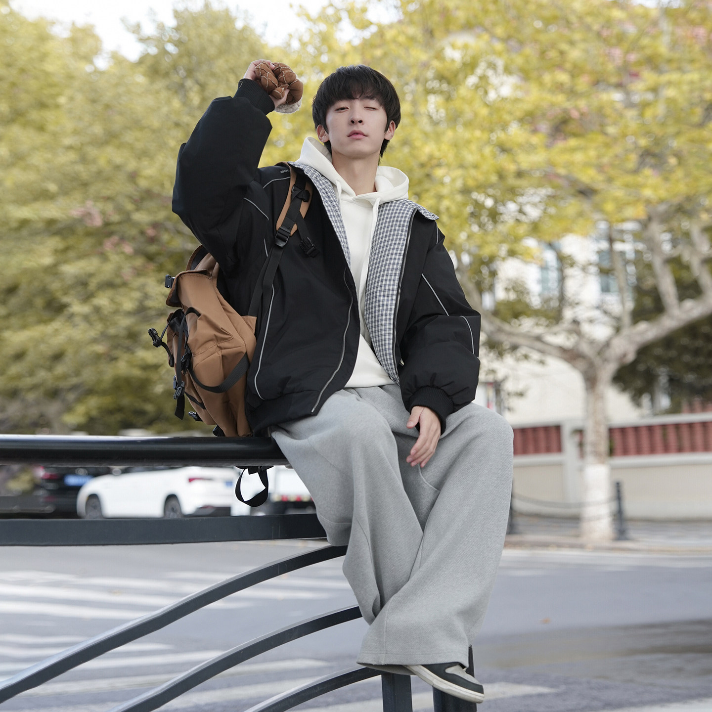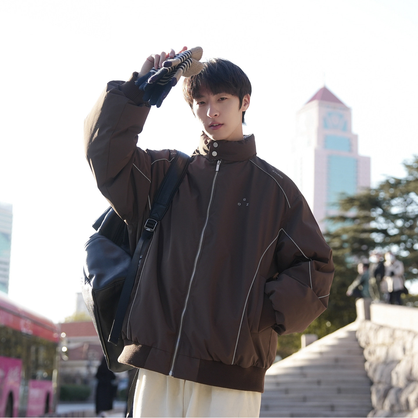 GOOZI MADE反光条格子棉服男冬季加厚短款面包服美式立领棉衣外套