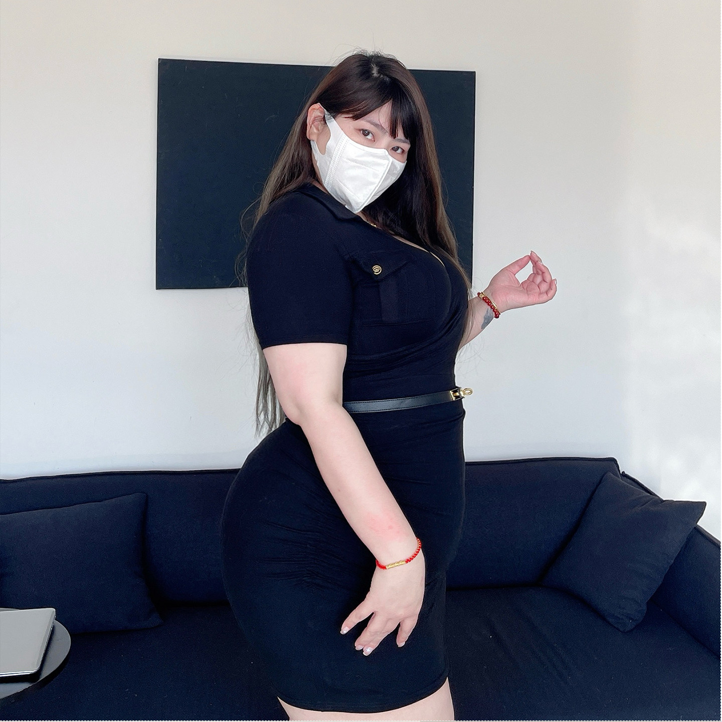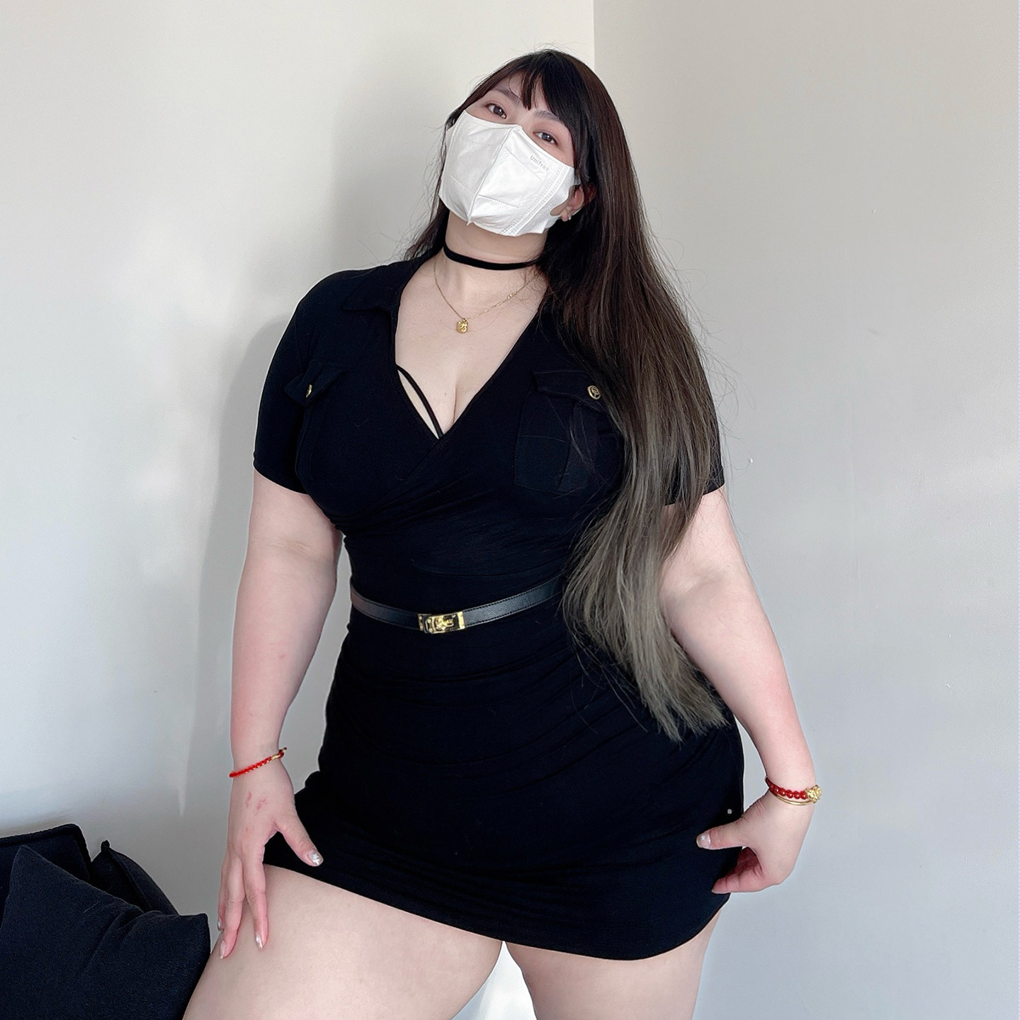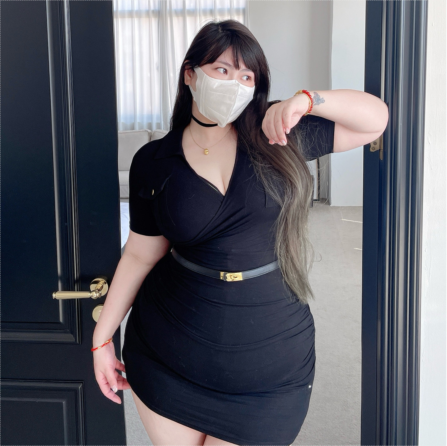 180的陈橙橙-肯豆深V大码女装性感微胖连衣裙显瘦黑色包臀裙裙子