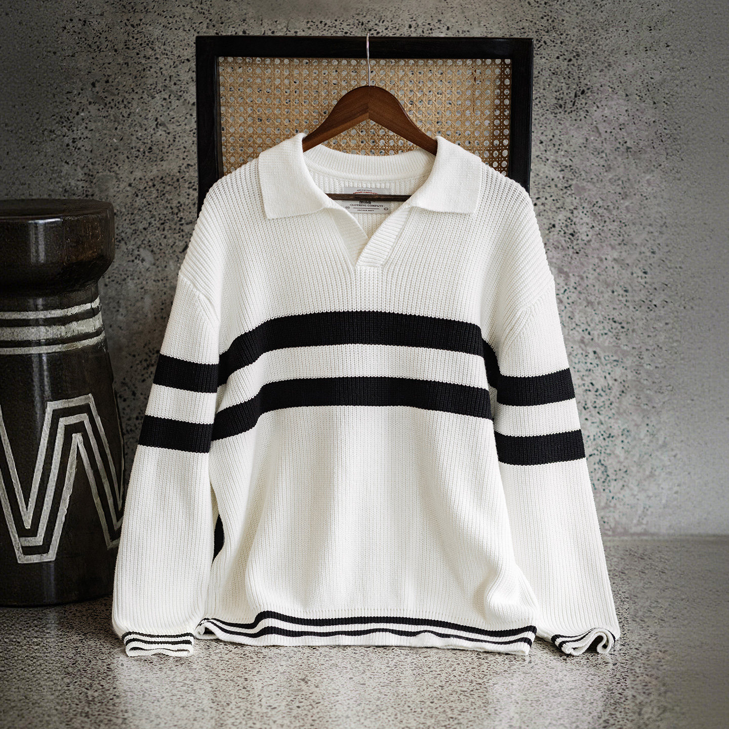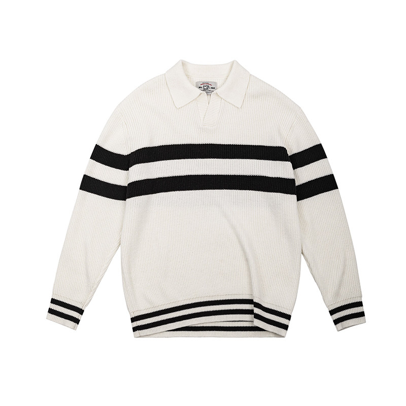 MRA男装IVY海鸥领POLO毛衣学院老钱风条纹白色加厚翻领针织衫潮冬