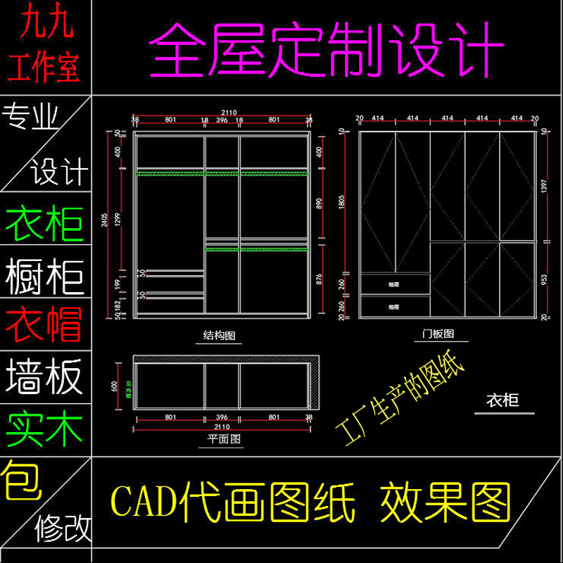 cad代画柜子衣柜橱柜 全屋定制设计效果图衣帽墙板榻榻米内部结构