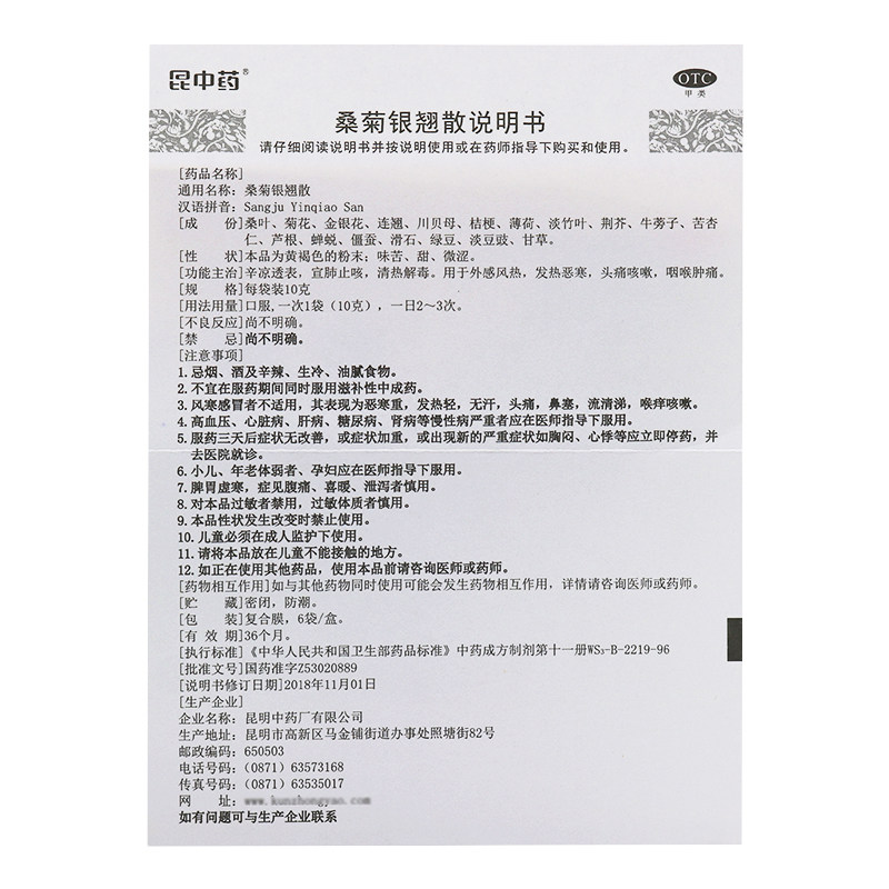 OTC昆中药桑菊银翘散6袋藿香正气风热感冒发热恶寒咳嗽宣肺止咳