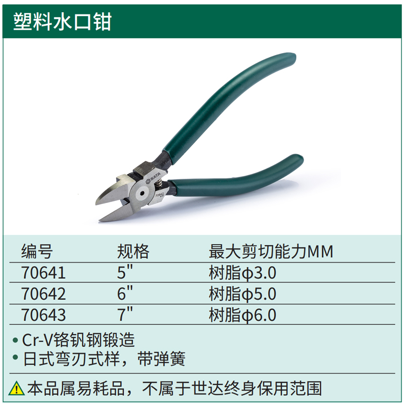 世达塑料水口钳偏口钳弹簧剪线钳6寸7寸斜嘴钳70641 70642 70643