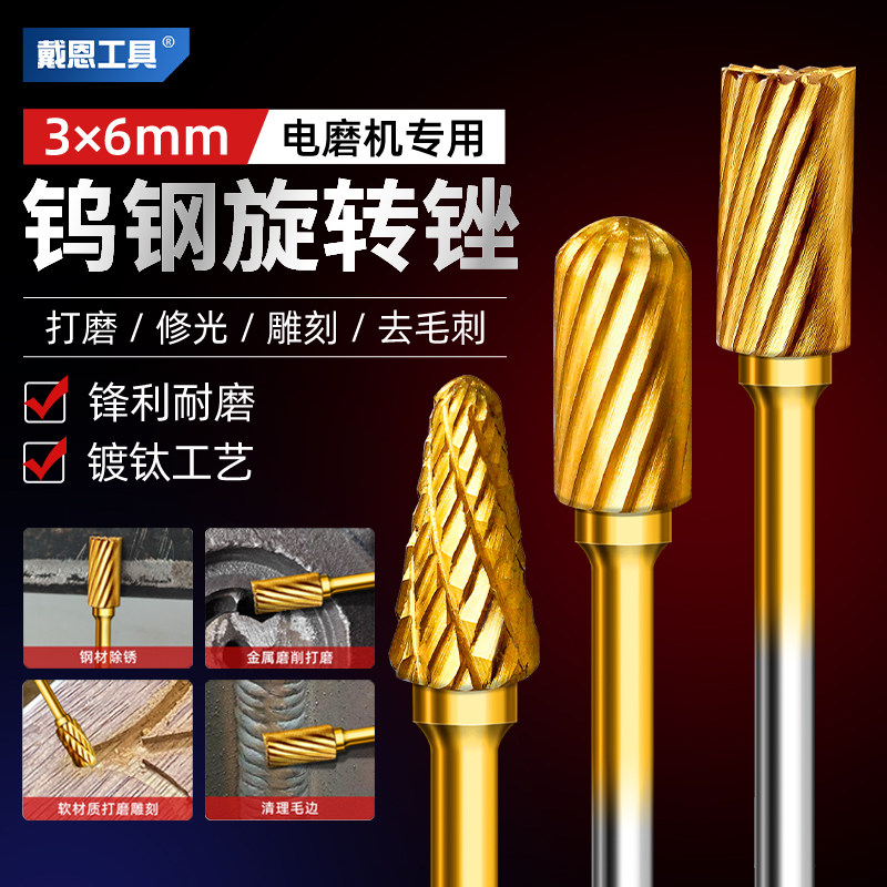 镀钛钨钢旋转锉打磨头电动电磨硬质合金磨头小铣刀手电钻锉刀3mm