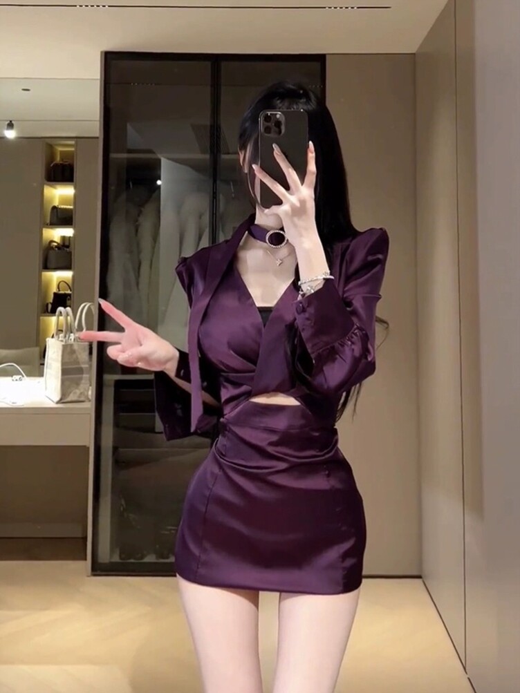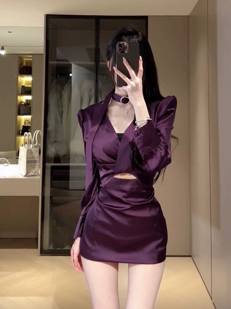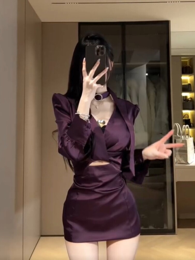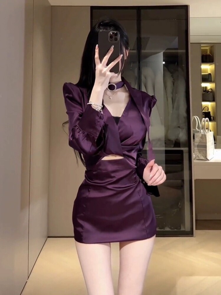 法式高级性感紫色衬衫连衣裙女春季气质名媛修身成熟御姐包臀短裙