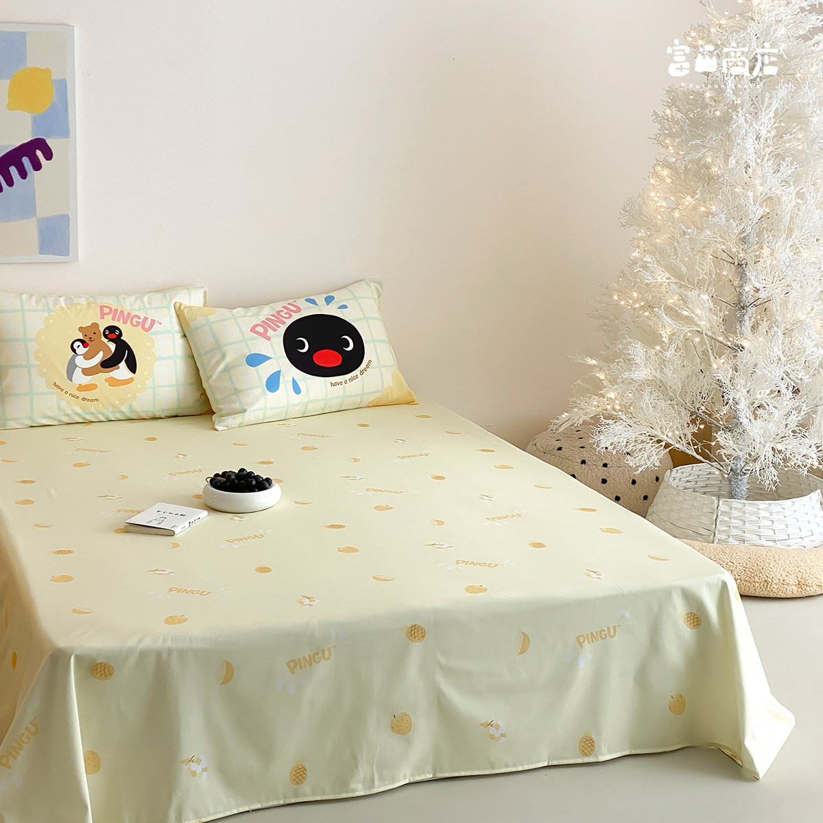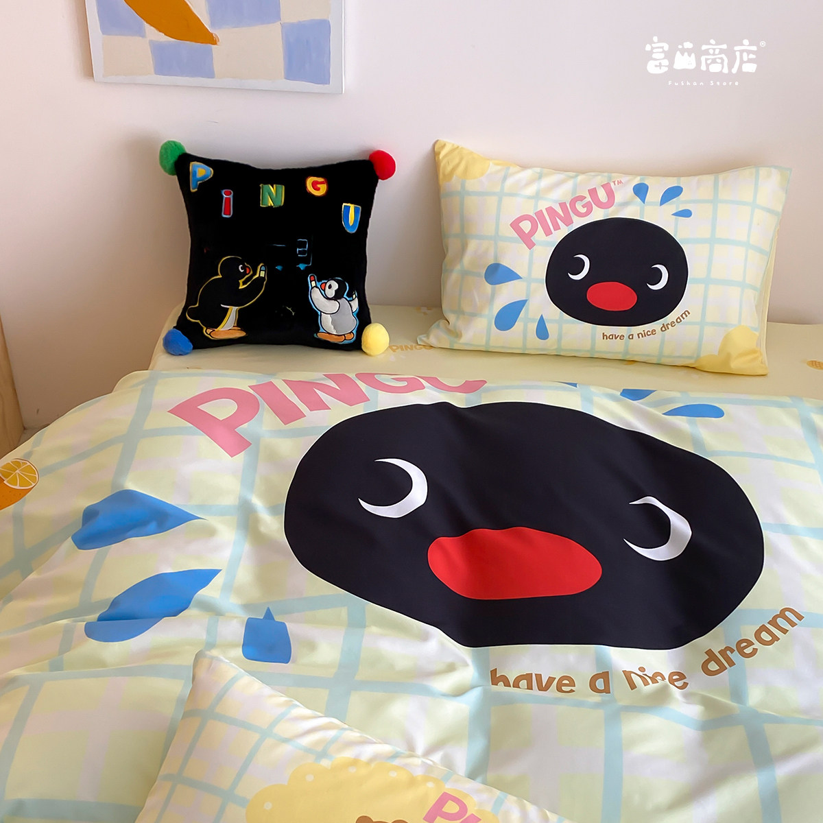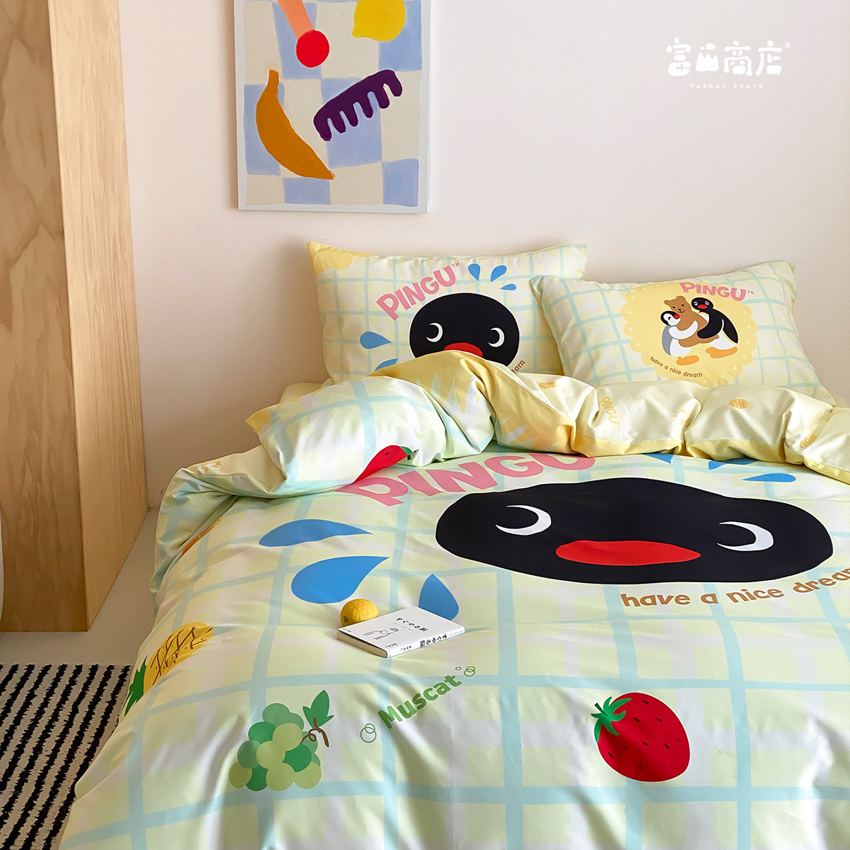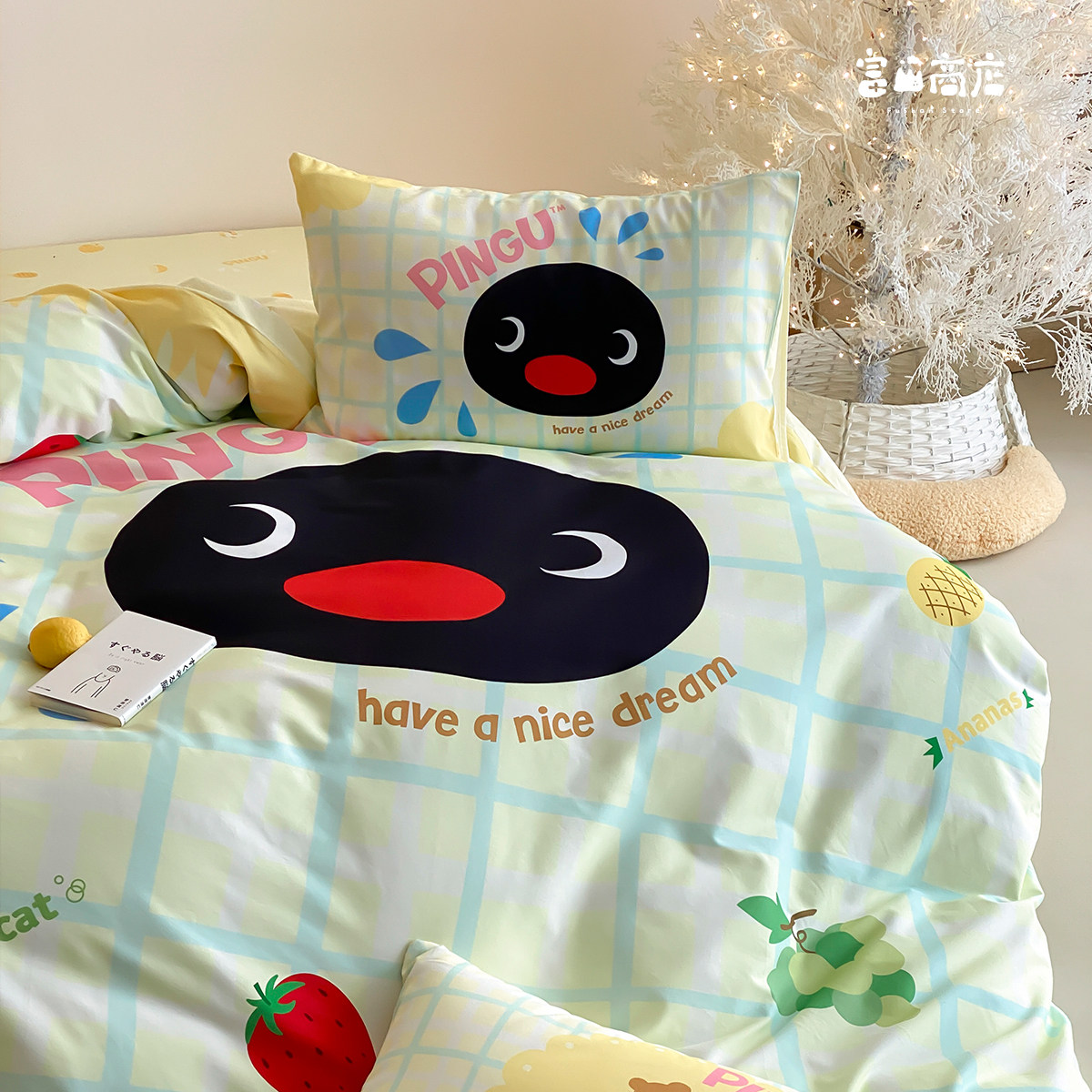 富山商店 x Pingu企鹅家族卡通可爱黄绿色格纹100%棉床上四件套