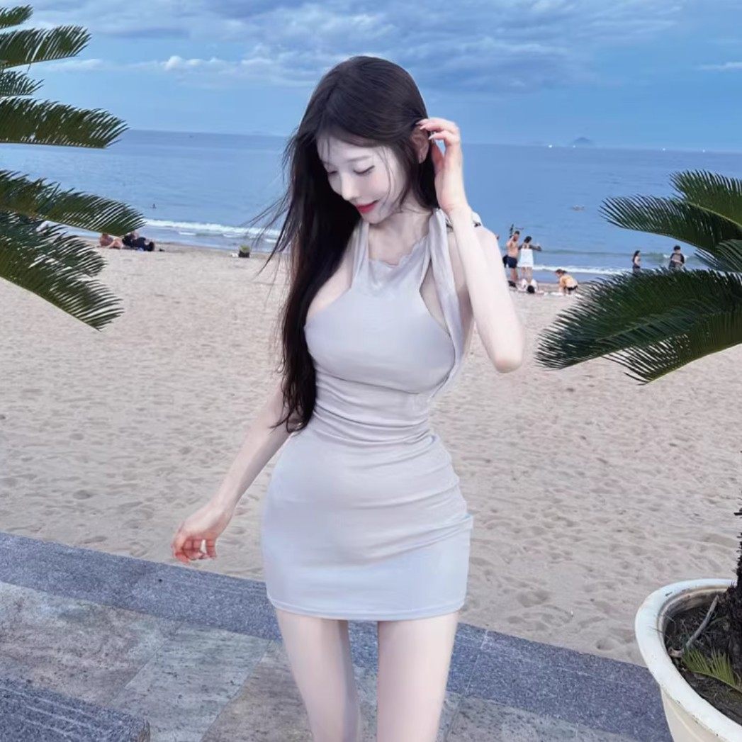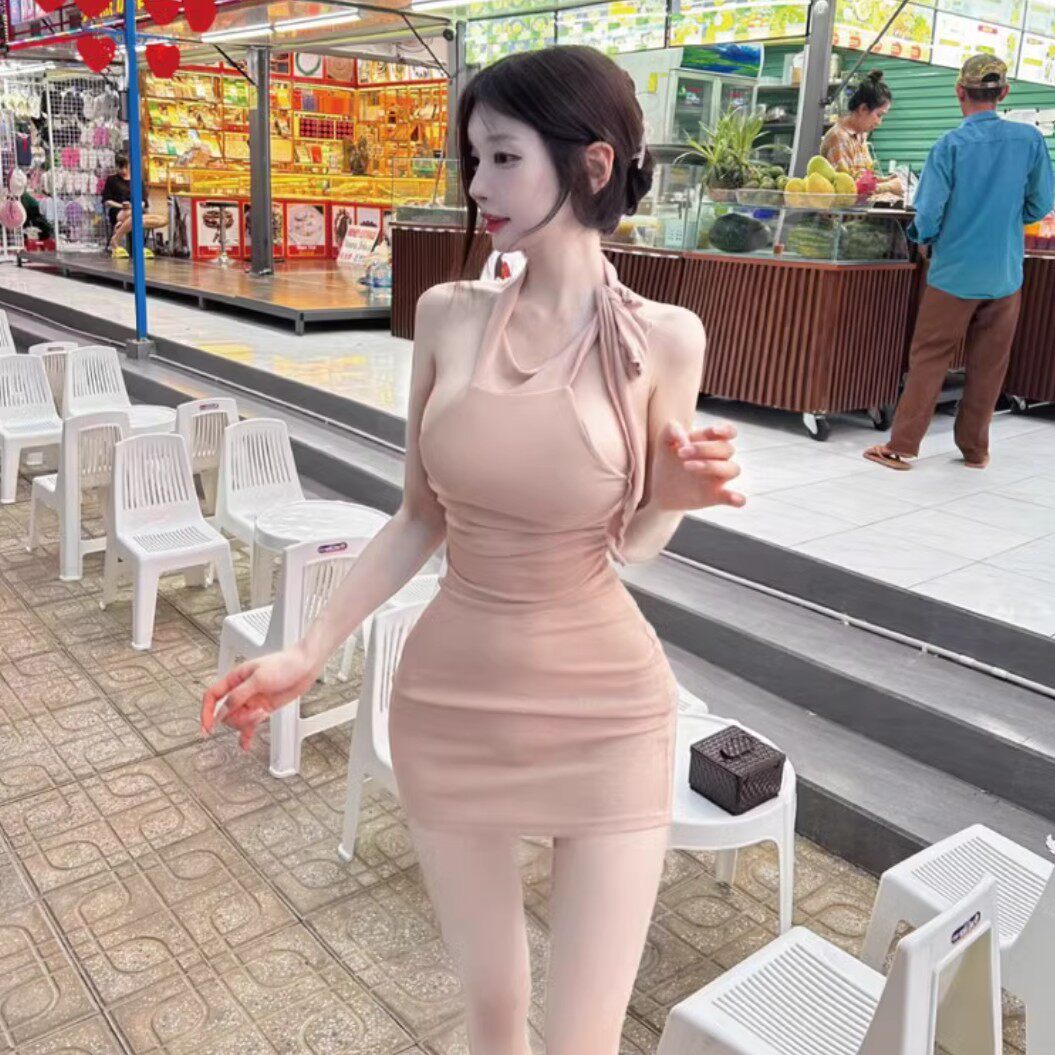 51STUDIO自制 粉色纯欲抽褶包臀性感露背挂脖系带紧身连衣裙短裙