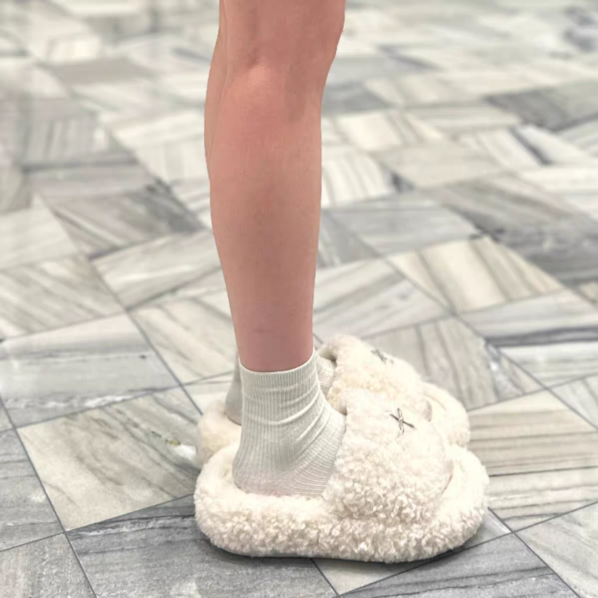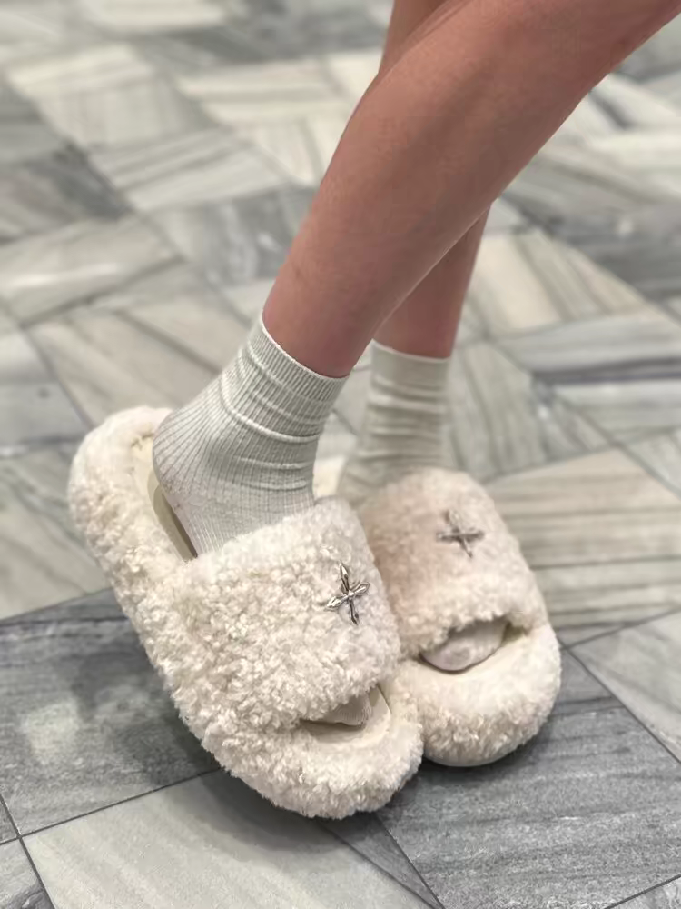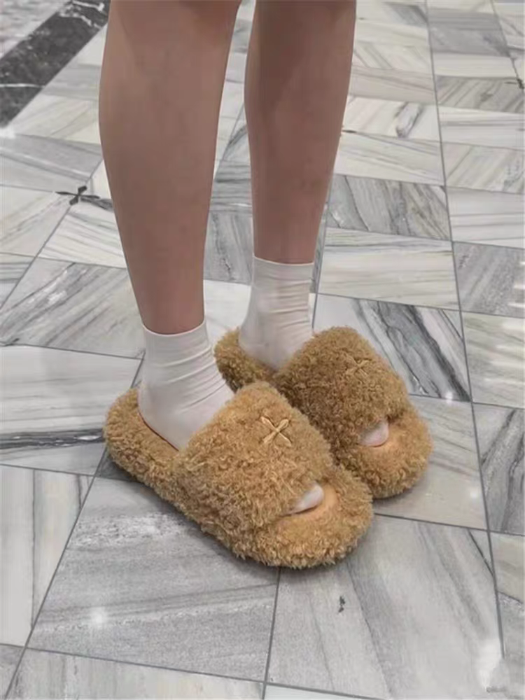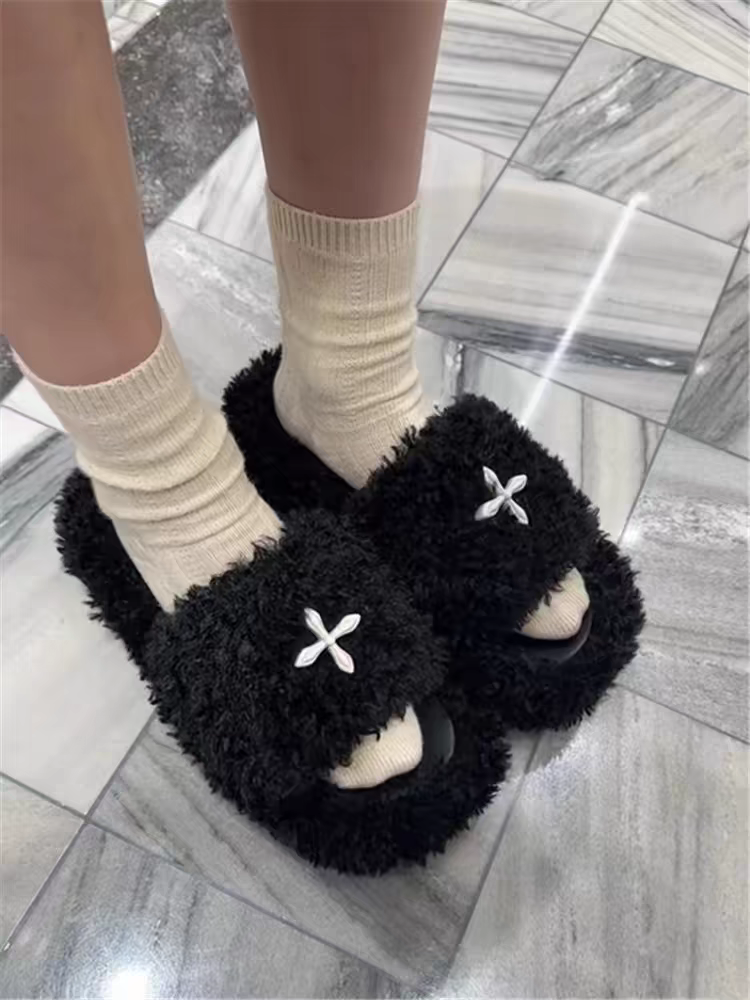 毛毛拖女外穿十字花拖鞋厚底一字拖鞋百搭黑丝绒毛毛拖鞋毛茸茸