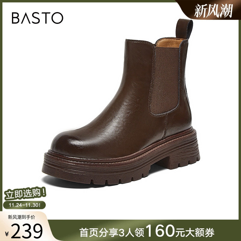 百思图冬季商场新款百搭厚底增高切尔西靴烟筒靴女短靴W8071DD4