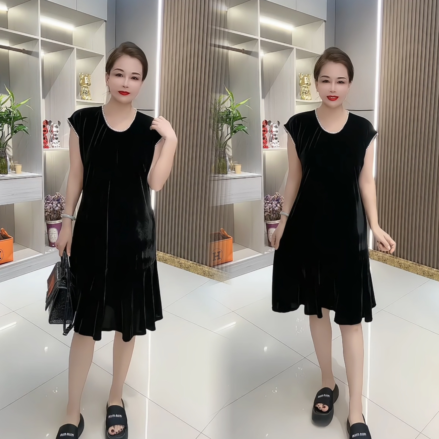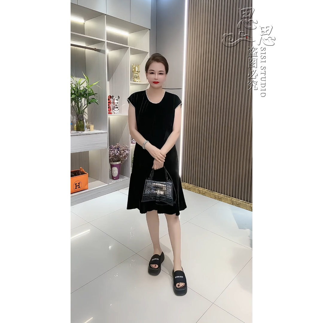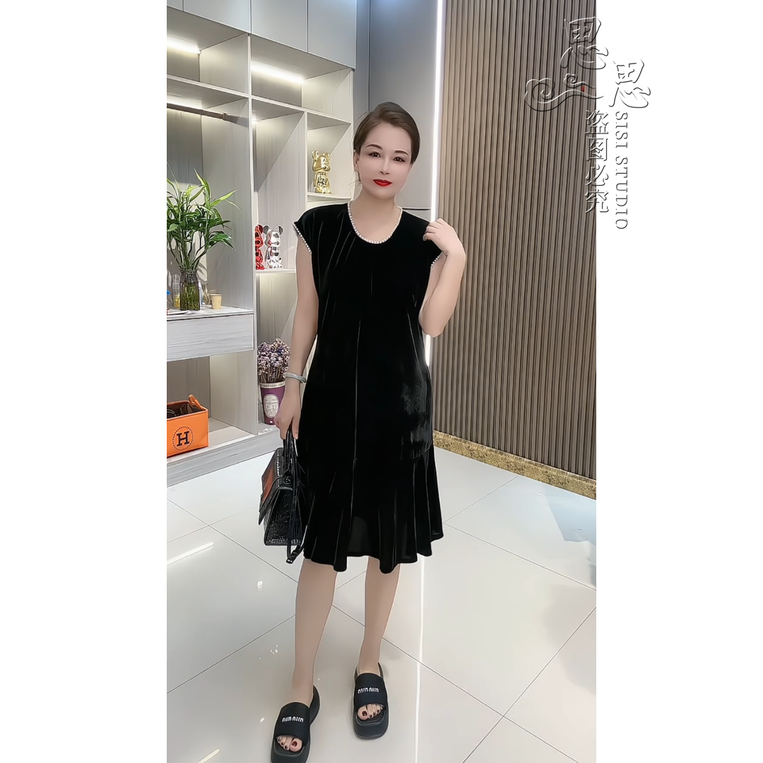 大码金丝绒时尚连衣裙夏季女士新款串珠V领钉珠美背双兜短袖裙子