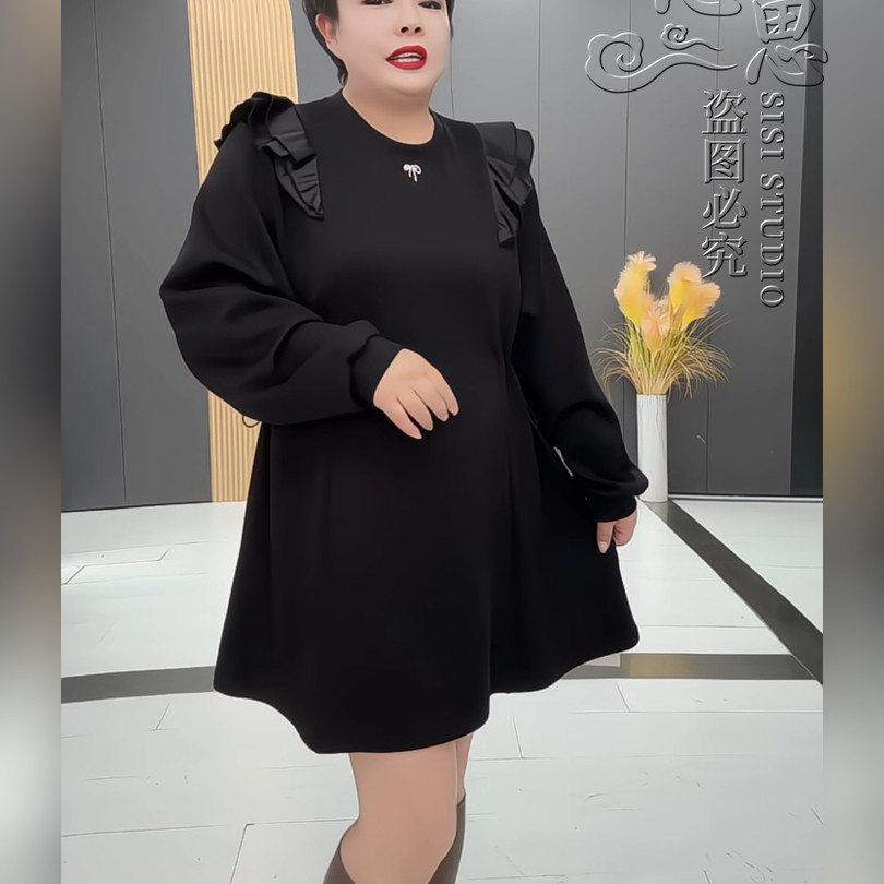 大码加厚遮肉打底连衣裙冬季女士新款圆领拼接木耳边抽绳显瘦裙子