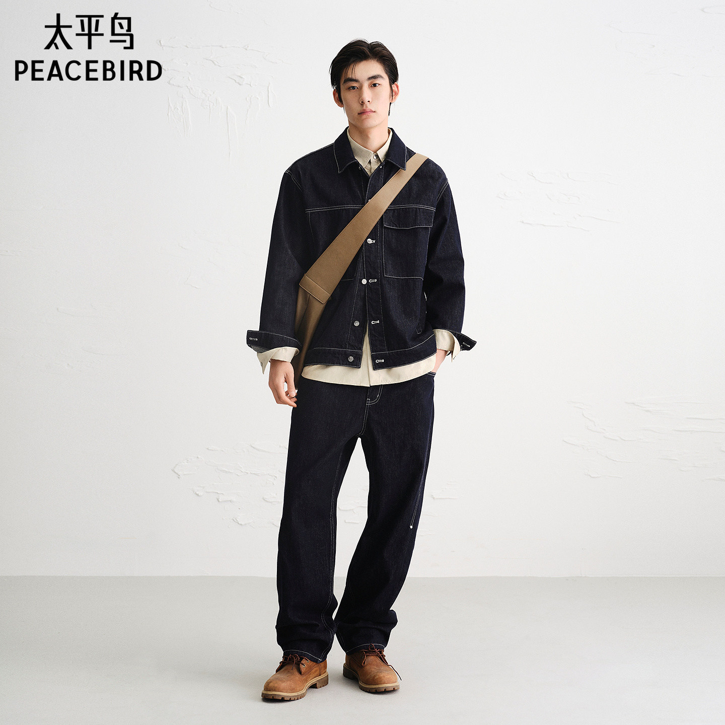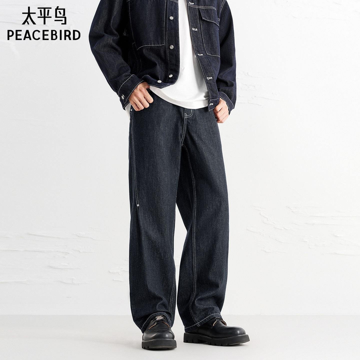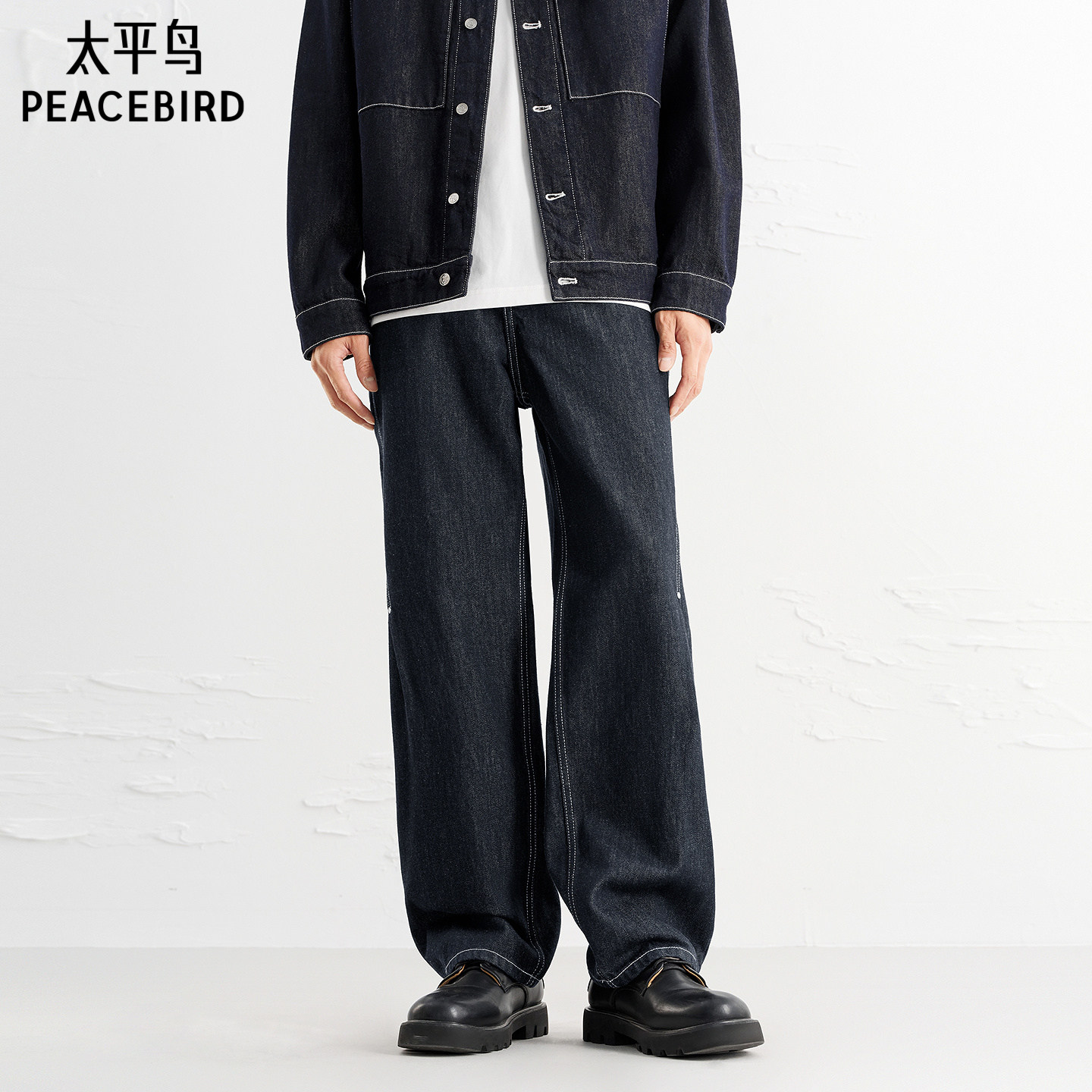 太平鸟男装 牛仔裤25秋新款明线纯棉牛仔原牛宽松直筒撞钉长裤潮K