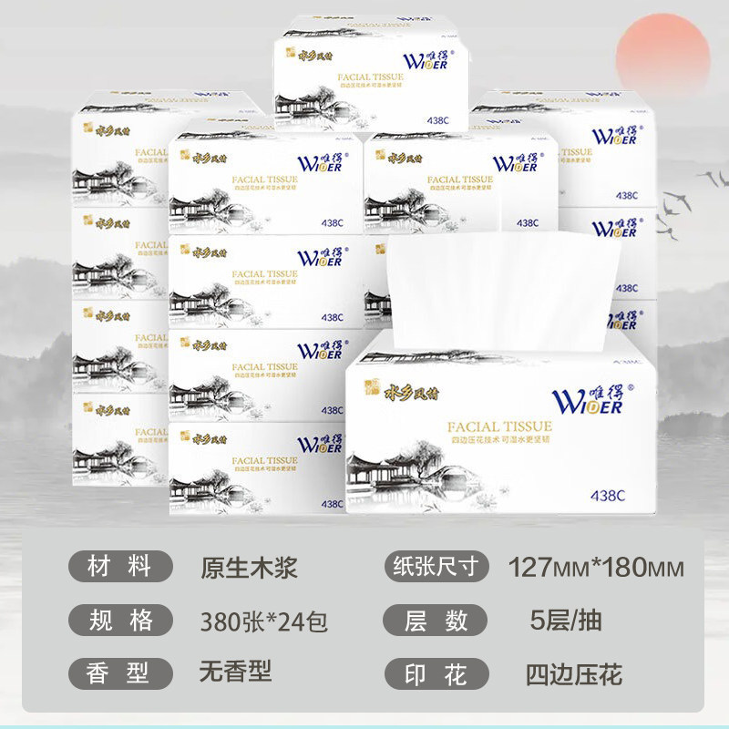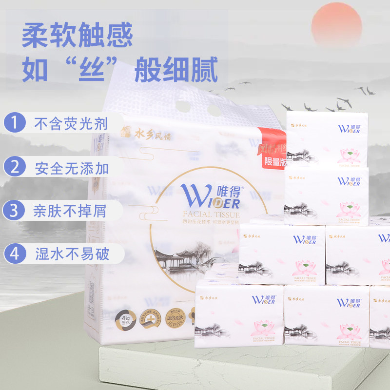 唯得抽纸水乡风情原木浆可湿水家用整箱5层加厚纸面巾批438C正品