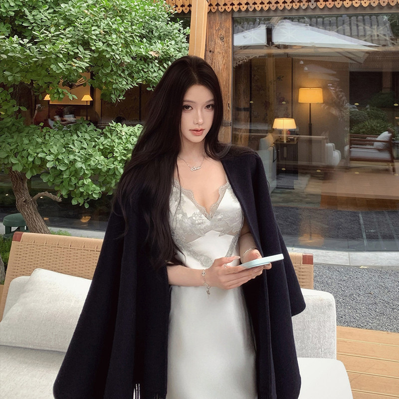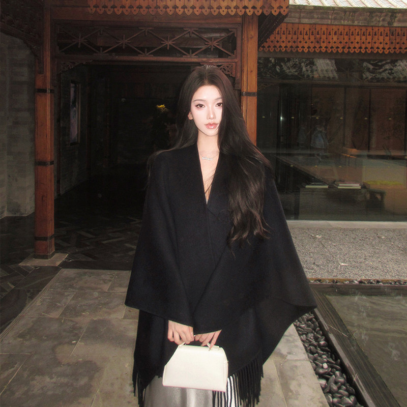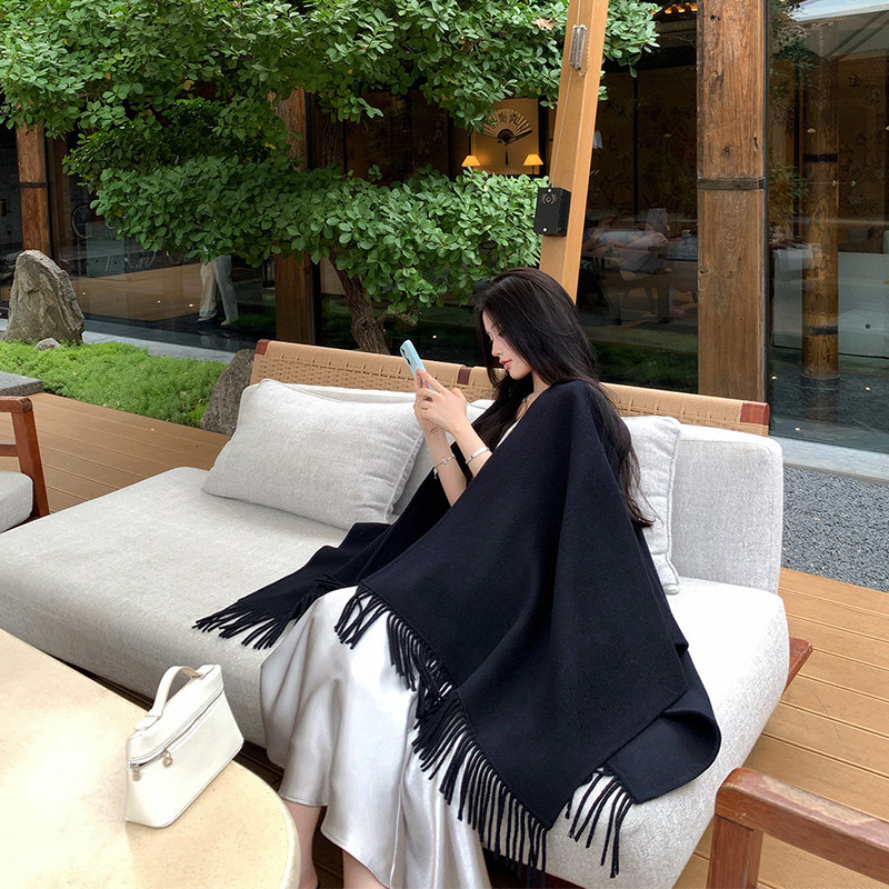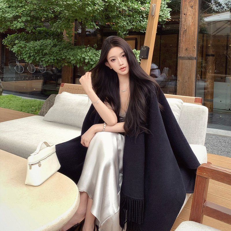 黑色羊毛披肩女外搭2026新款高级感纯色流苏保暖斗篷披风围巾两用
