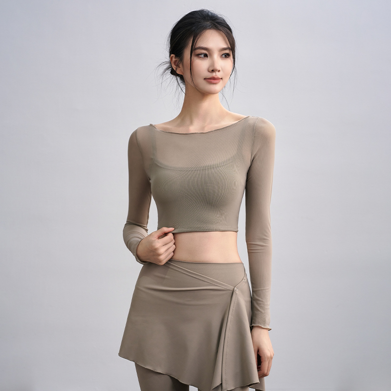 Ackdcs假两件瑜伽服上衣女秋冬带胸垫运动T恤网纱拼接长袖健身衣