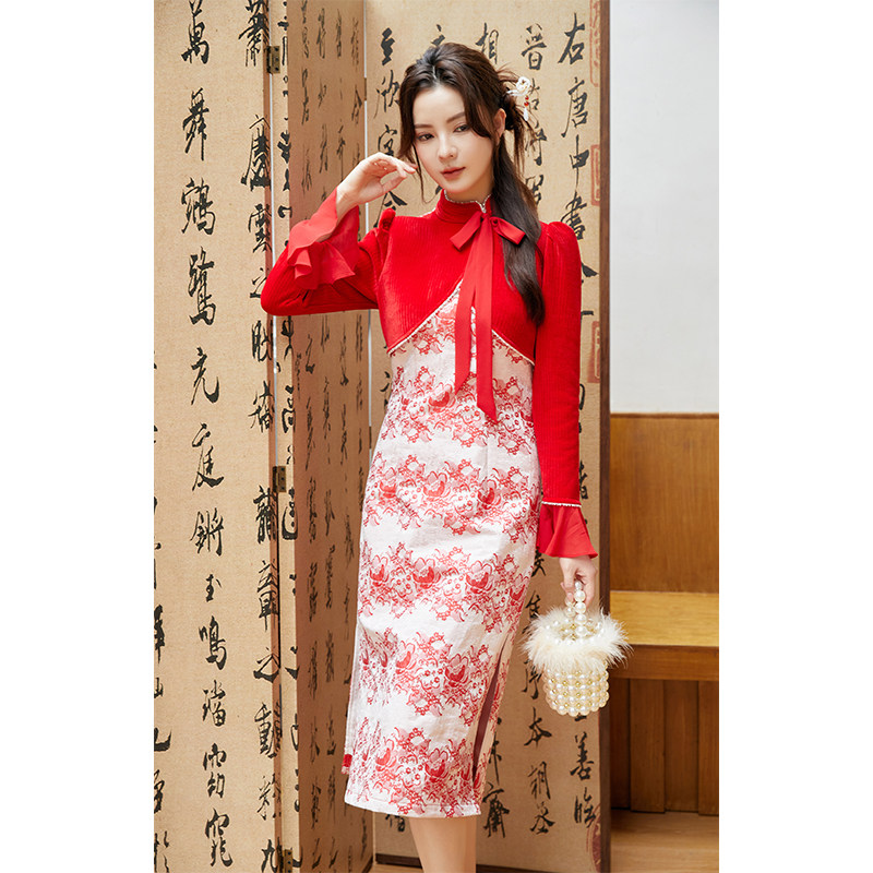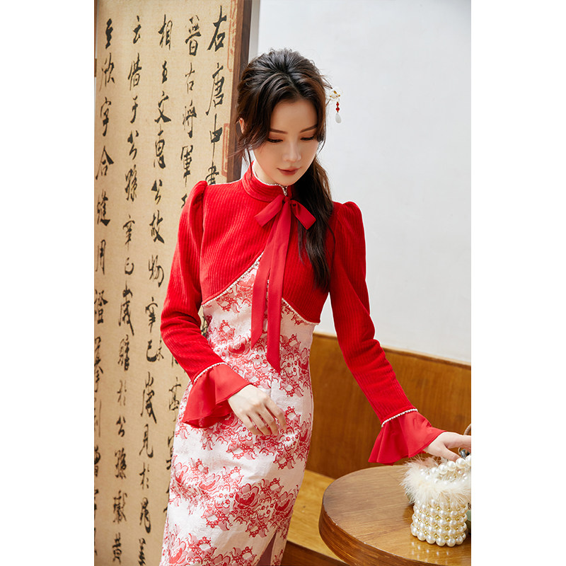 中国红旗袍2025新款冬装改良旗袍年轻款高端气质中式中国风蝴蝶结