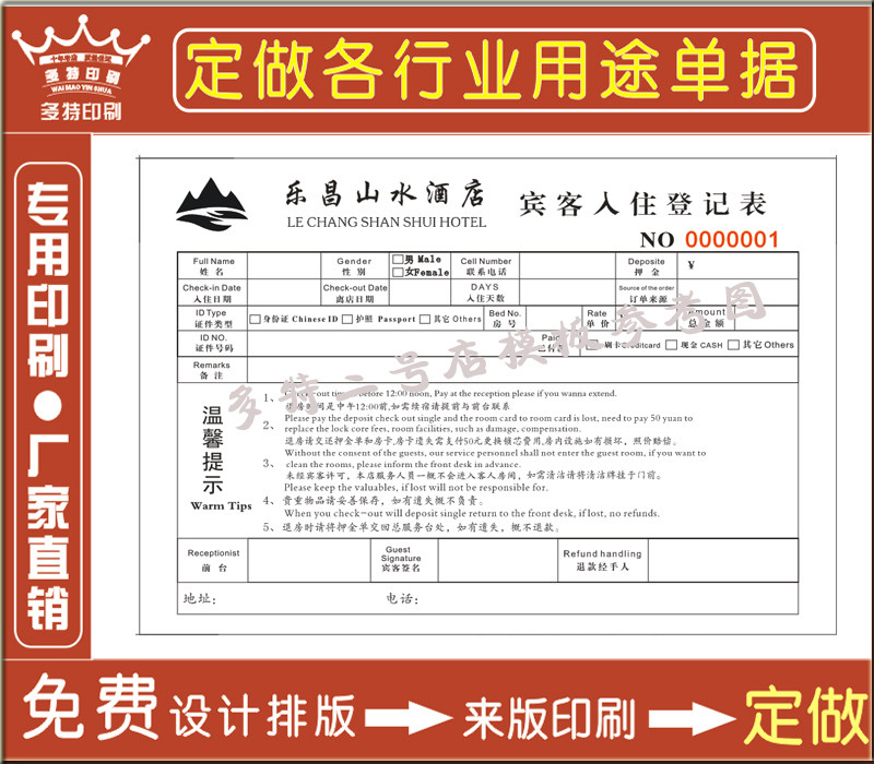 酒店行业押金单印刷二联三联入住登记表 点菜单 收银结账单缴费单
