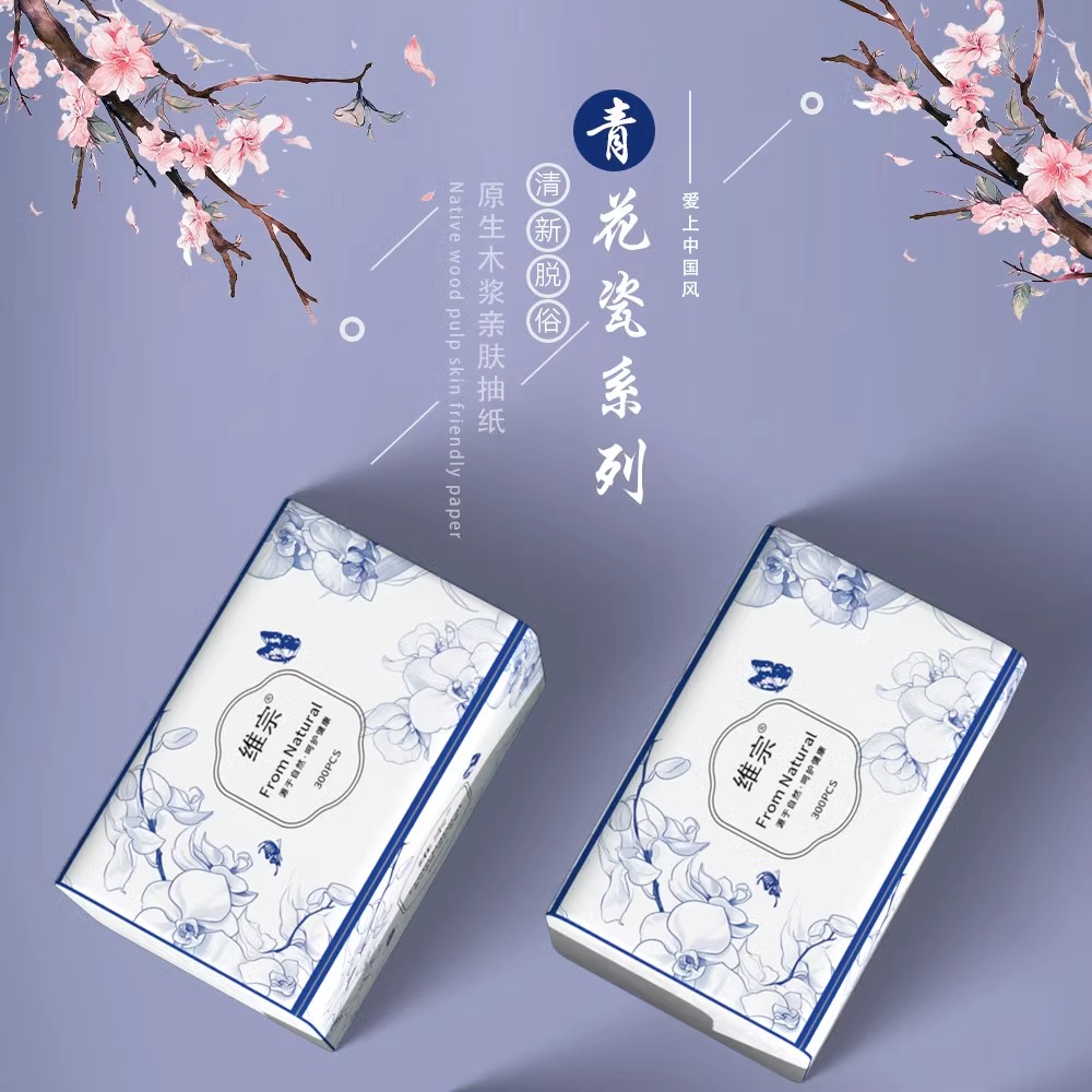 维宗青花瓷抽纸5层加厚300张大包纸巾家用实惠装餐巾纸卫生纸抽纸