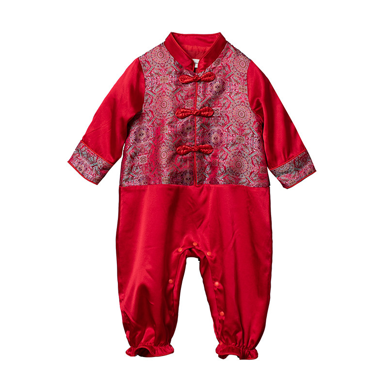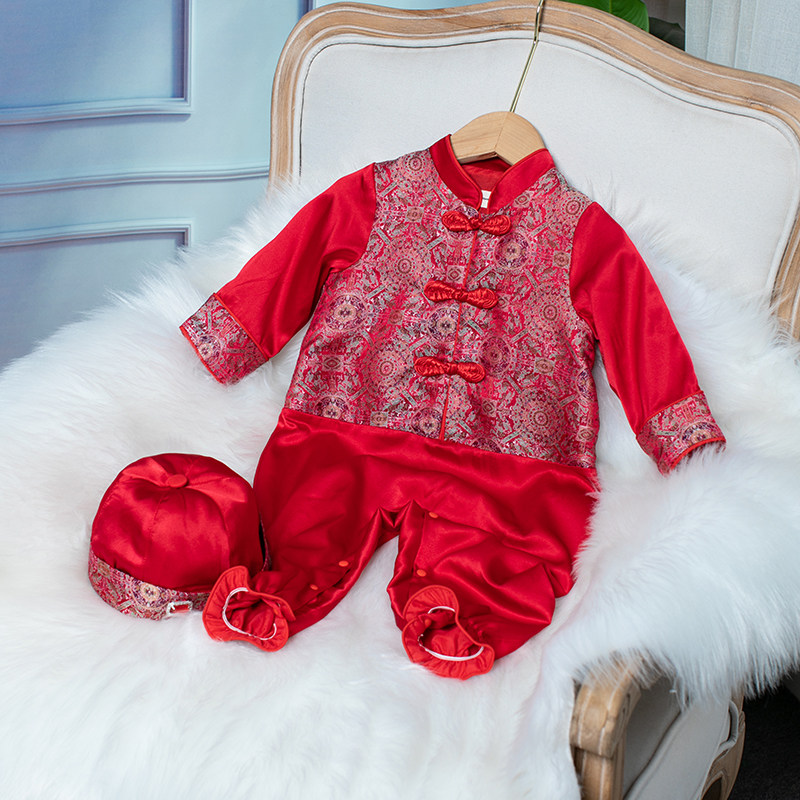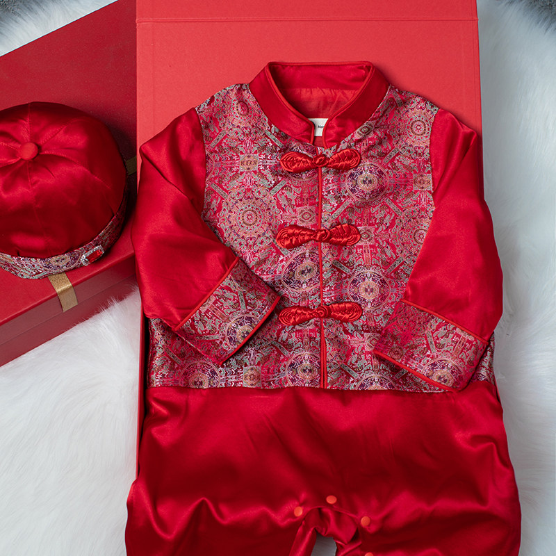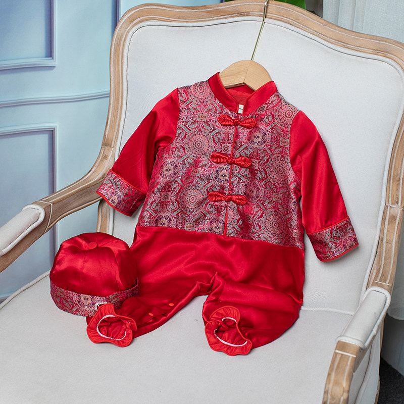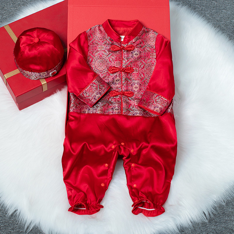 男宝宝周岁礼服真丝连体衣宋锦中国风抓周婴儿百天一岁冠衣唐装红