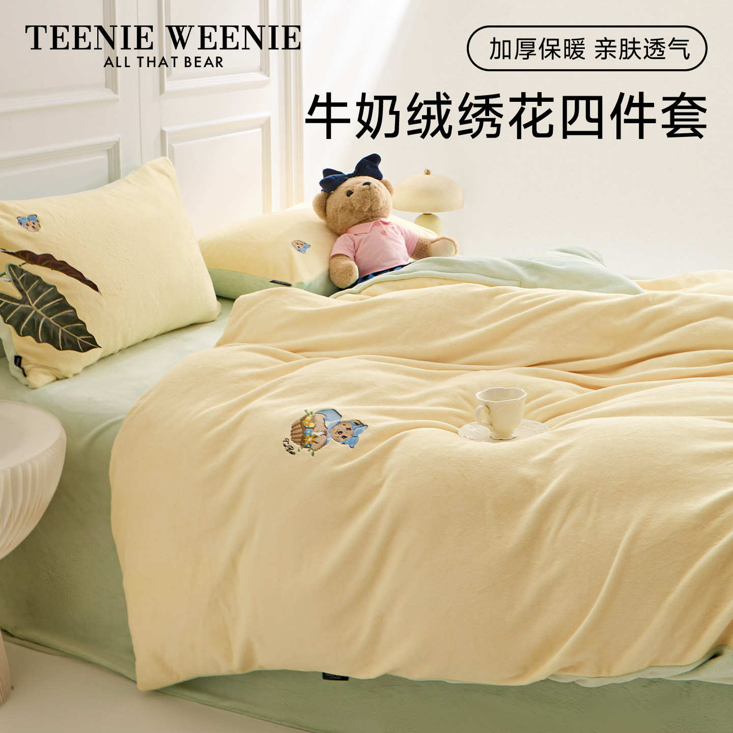 TeenieWeenie小熊刺绣牛奶绒床上用品四件套防静电加厚珊瑚绒被套