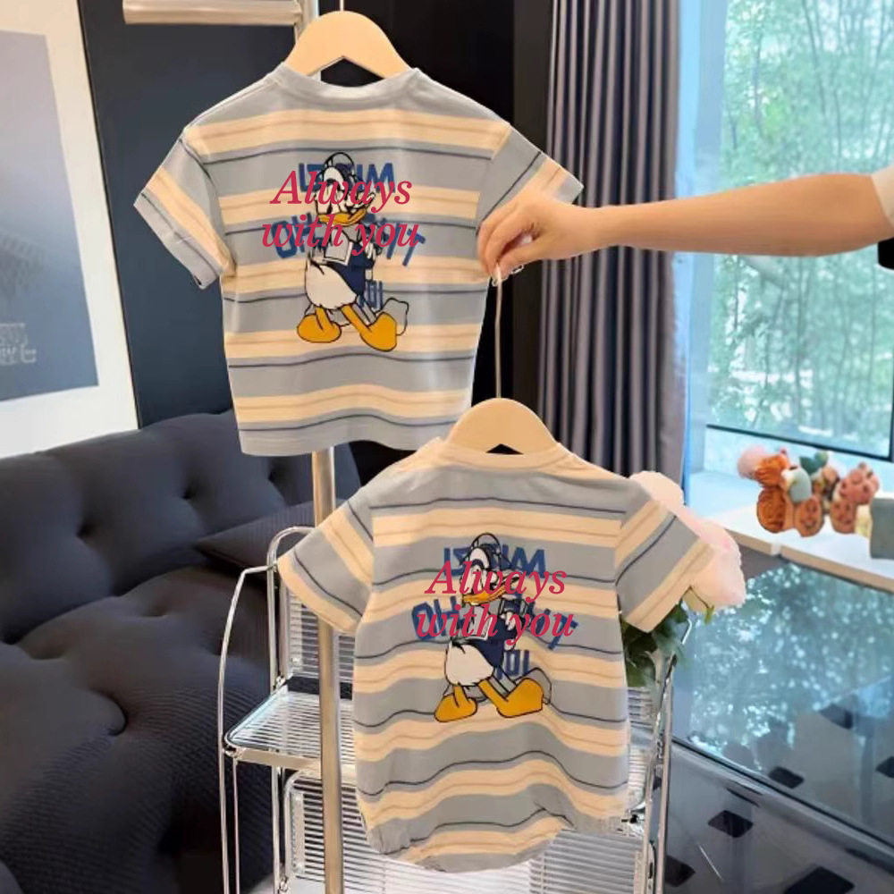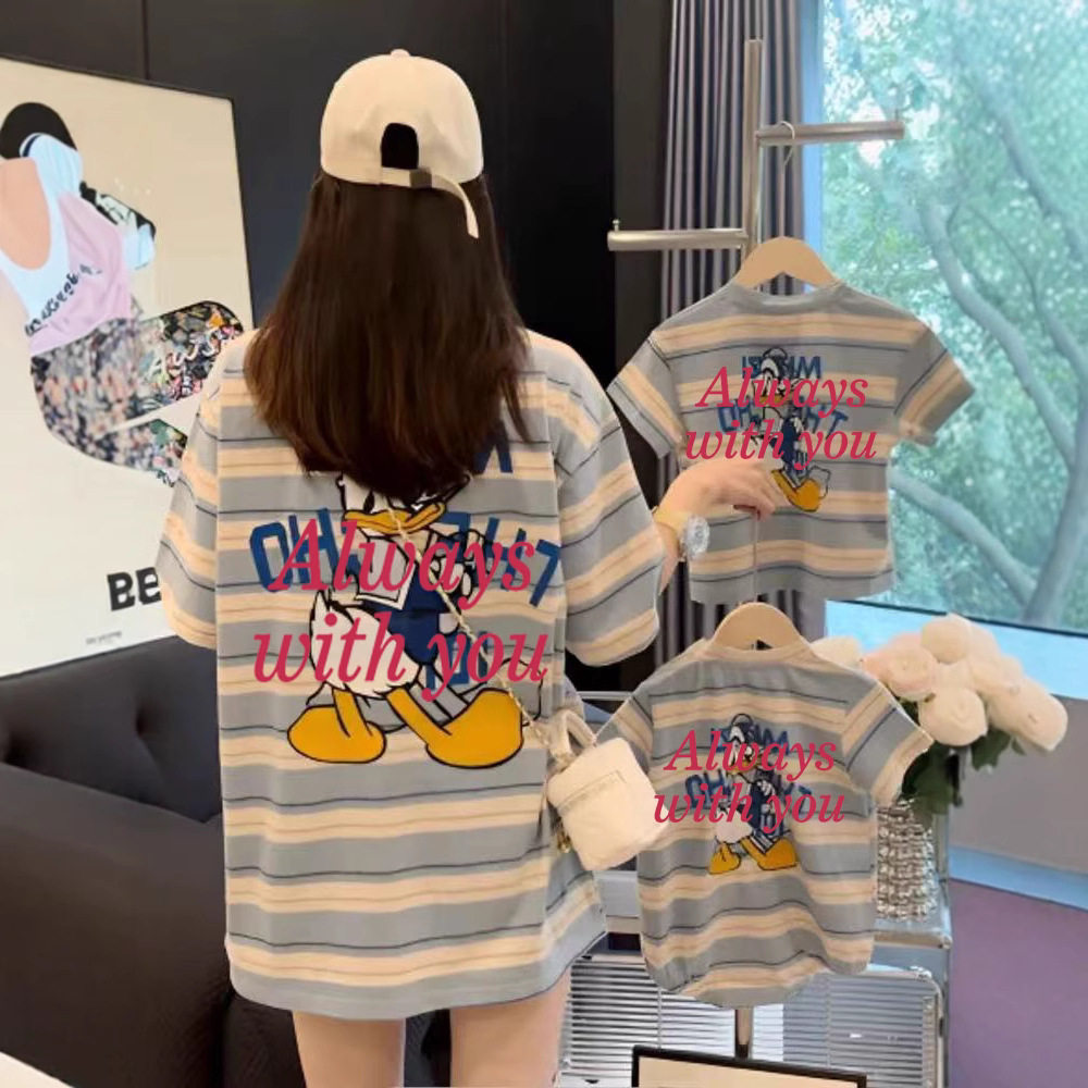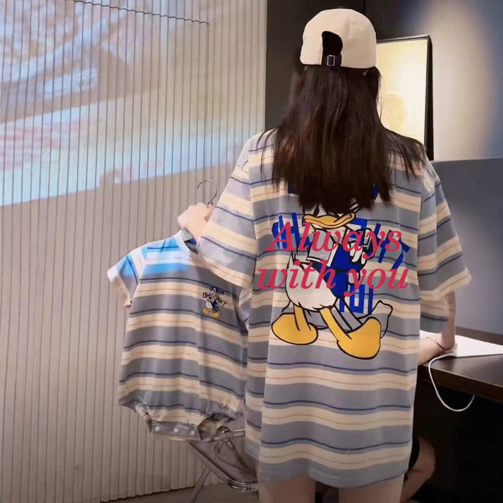卡通鸭条纹亲子装夏天T恤一家三口四口婴儿母子母女装条纹上衣YFC