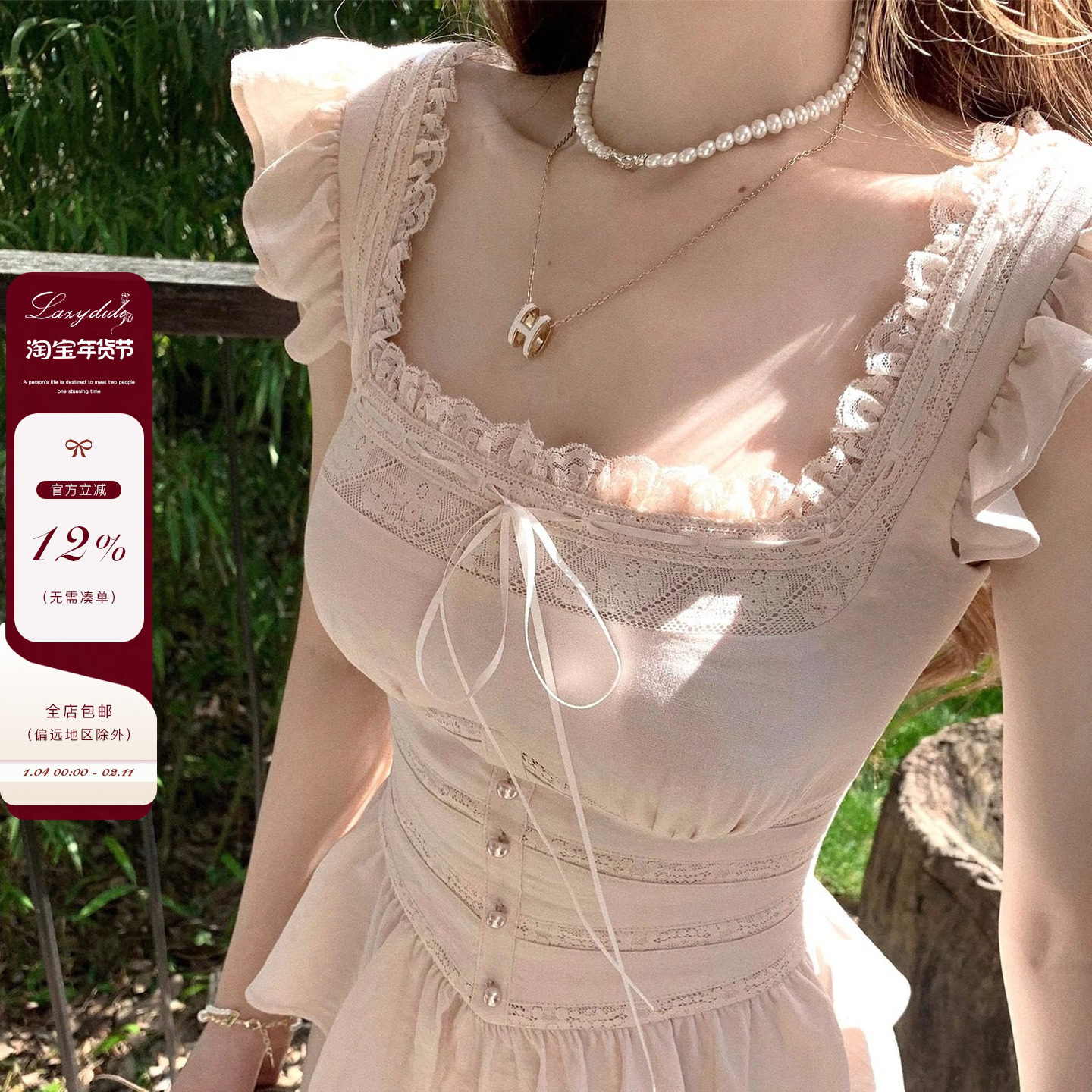 Lazy Didi玲奈纪事 淡颜系重工小飞袖上衣气质方领系带花边连衣裙
