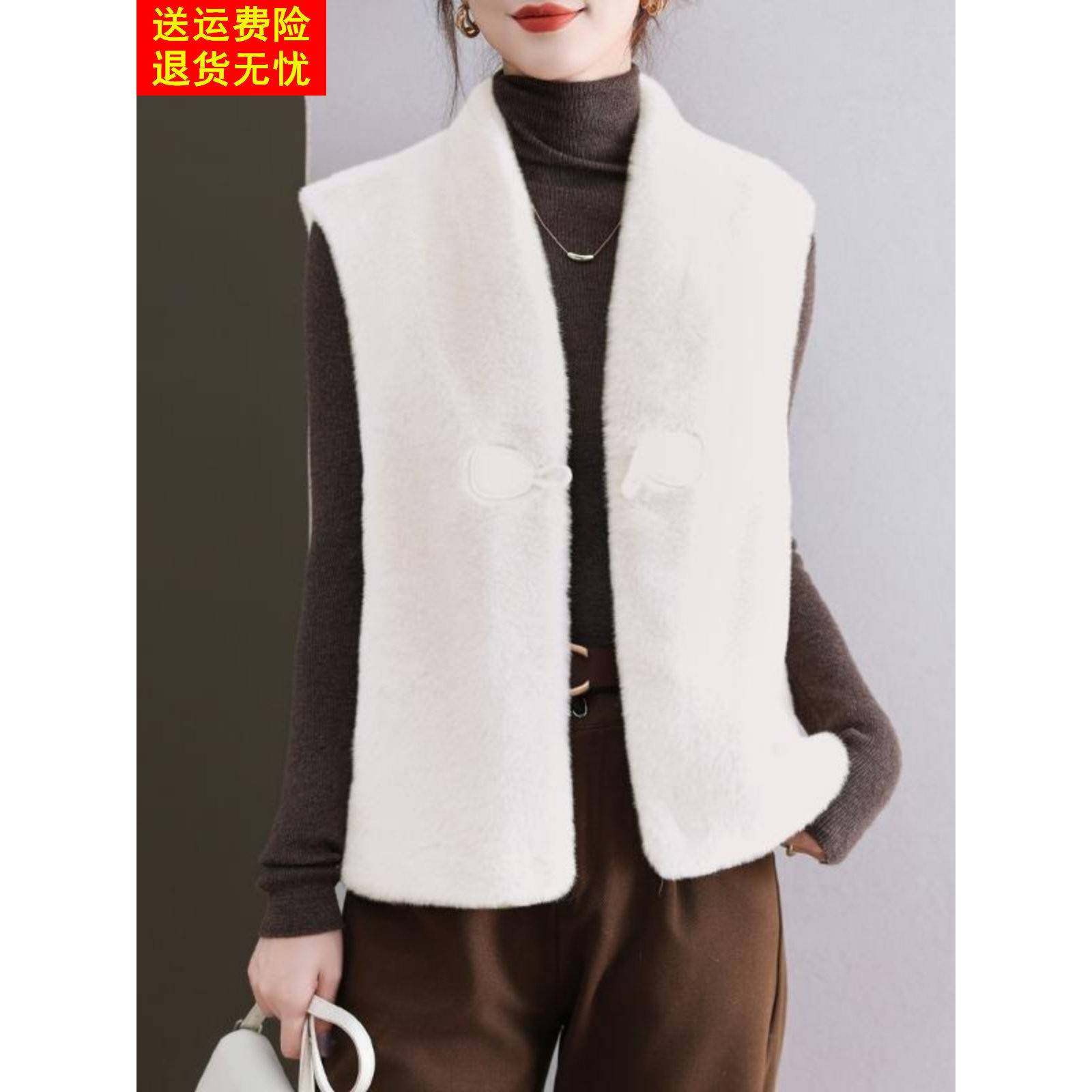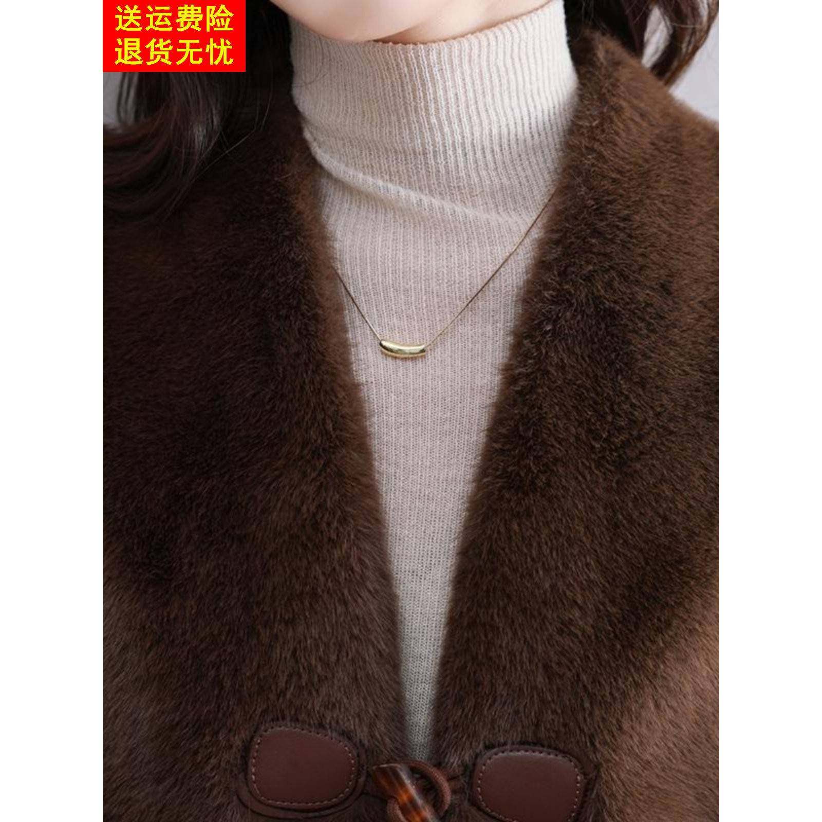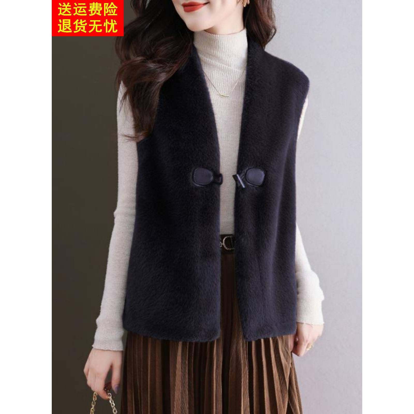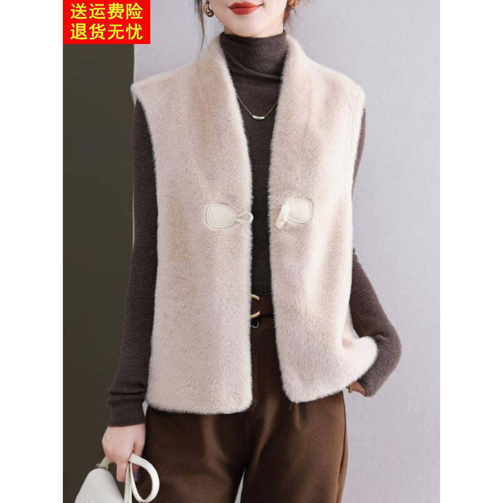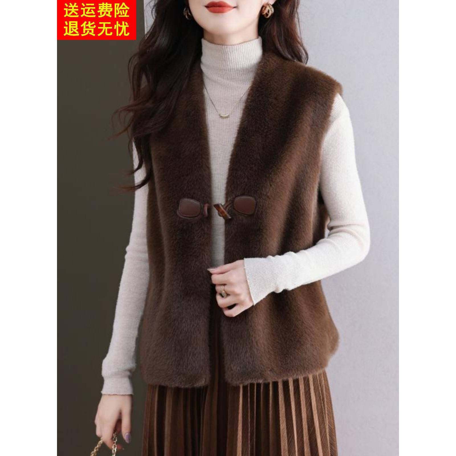 金貂绒皮草外套女士马甲V领短款水貂绒背心牛角扣皮毛一体坎肩厚