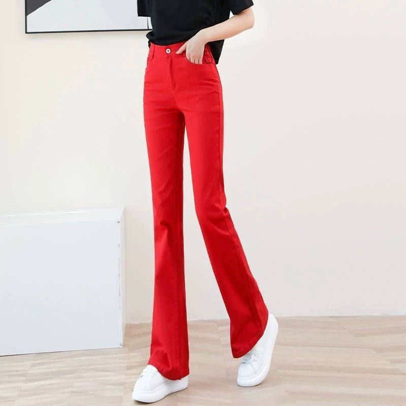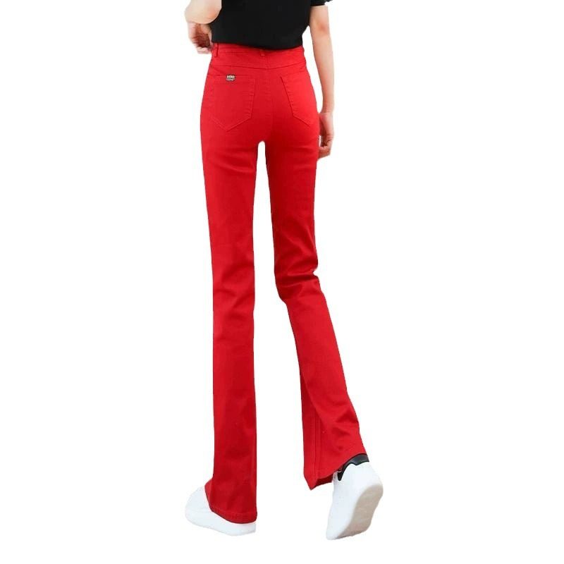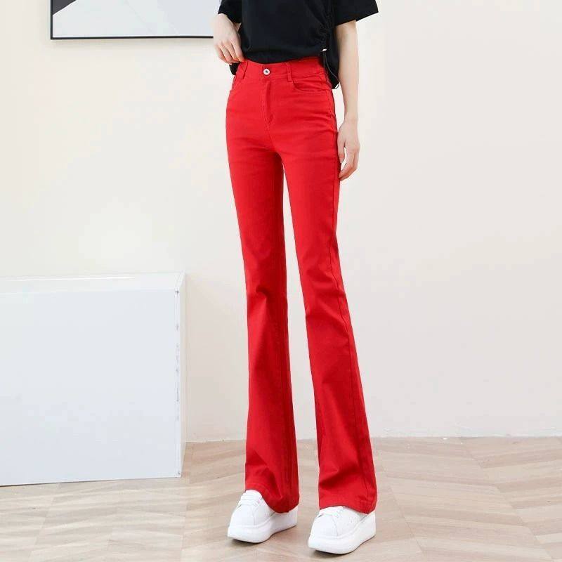 女士红色微喇牛仔裤2025冬季加绒加厚休闲高腰显瘦修身弹力微喇裤