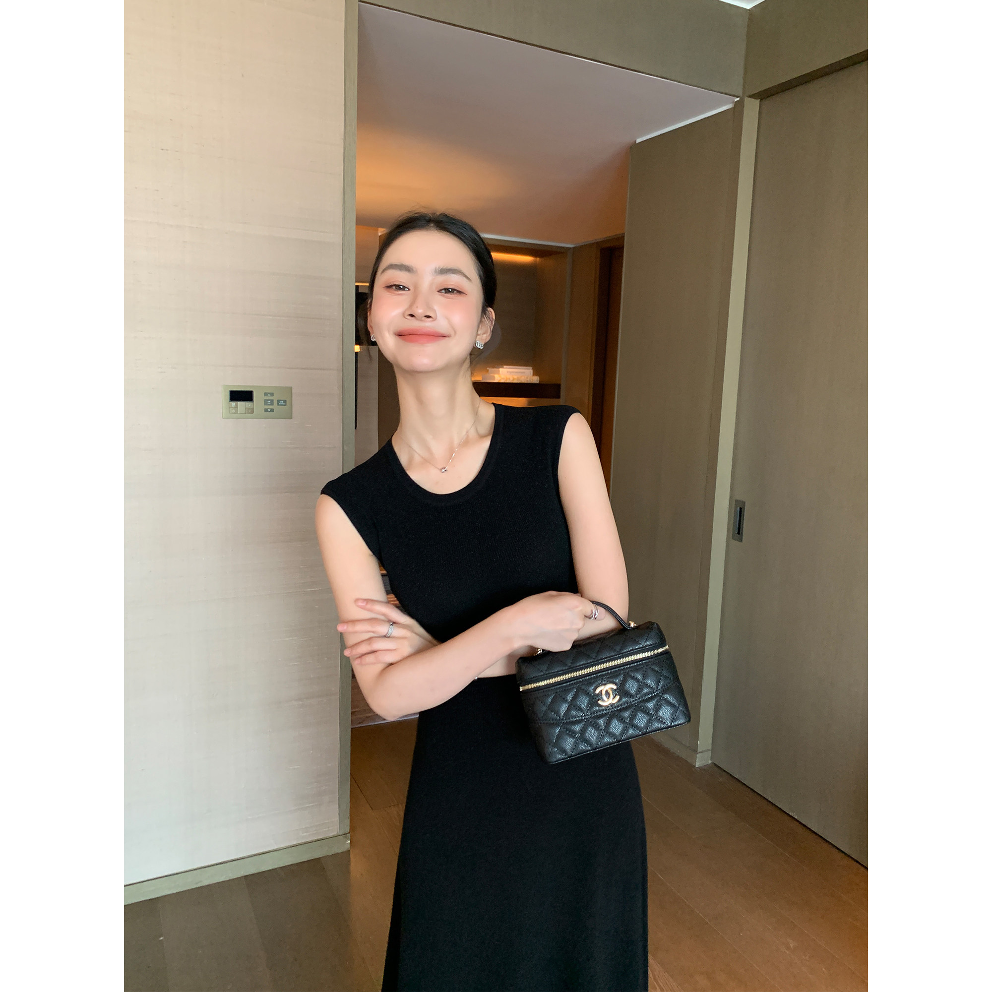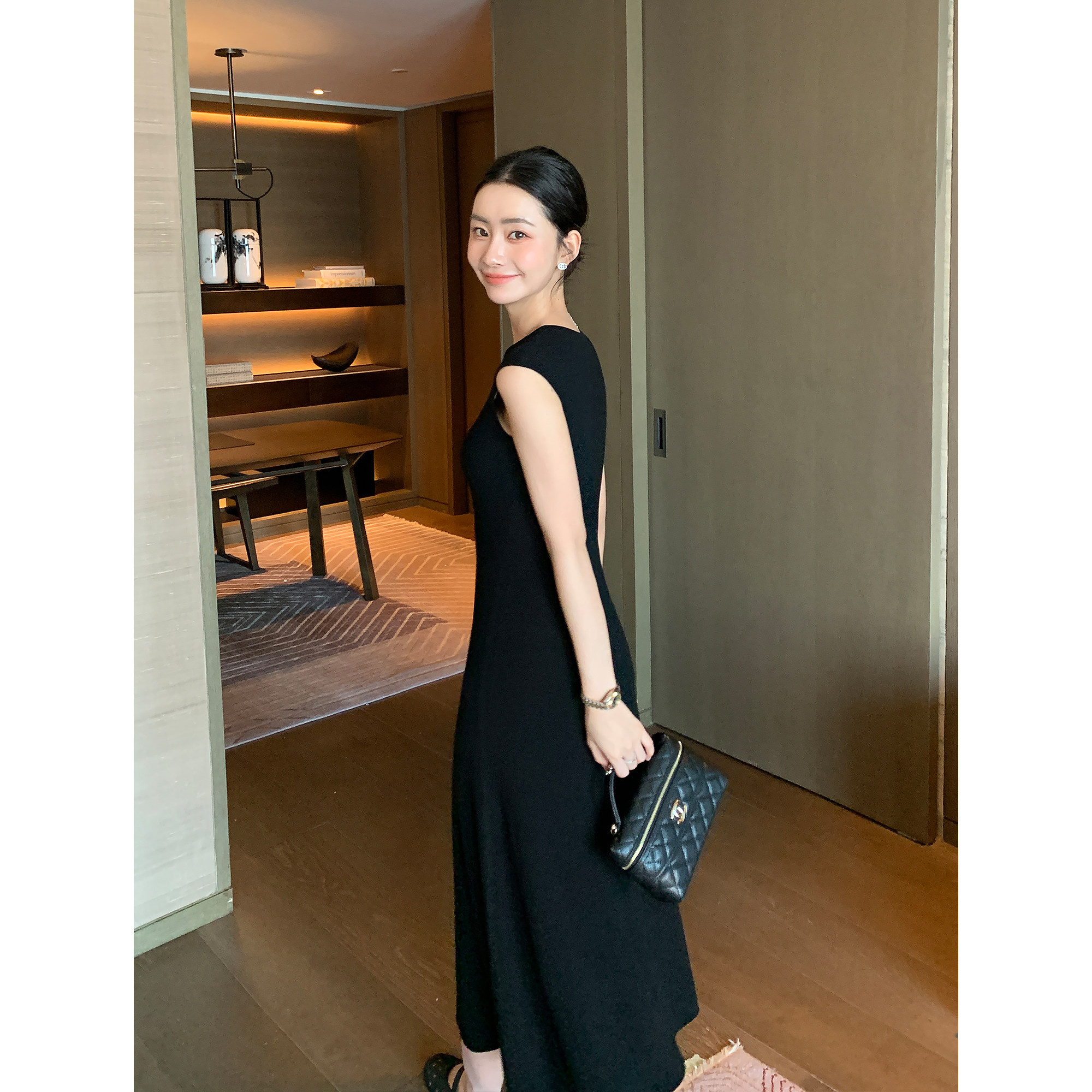 Maven Lin 气质圆领修身显瘦小黑裙女夏收腰背心裙长款无袖连衣裙
