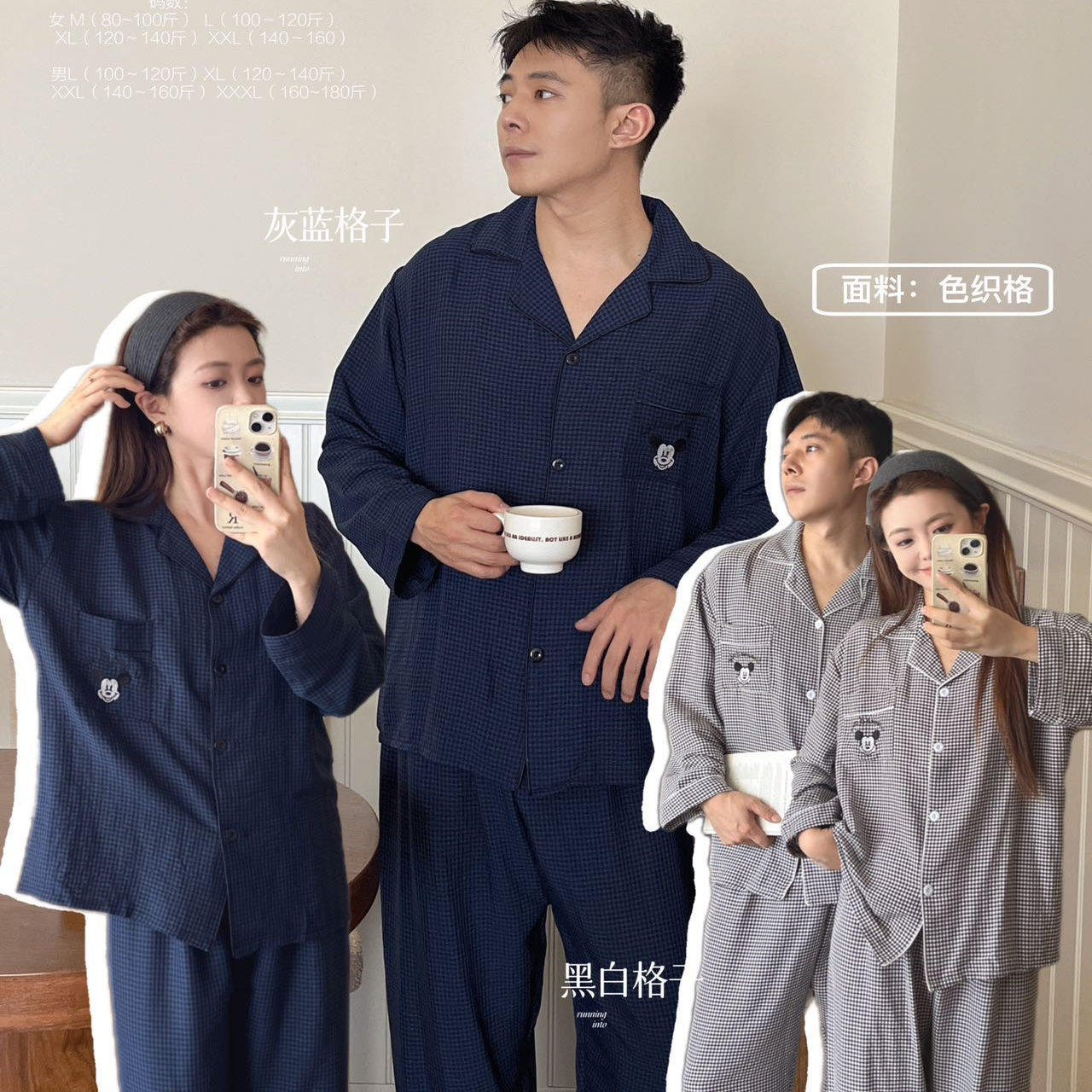 2025年新款春秋季软绵纱米奇格子睡衣套装情侣家居服男女士套装