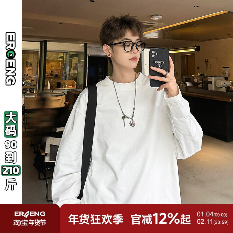 二更纯色宽松长袖t恤男款春秋简约休闲大码胖子圆领内搭打底上衣