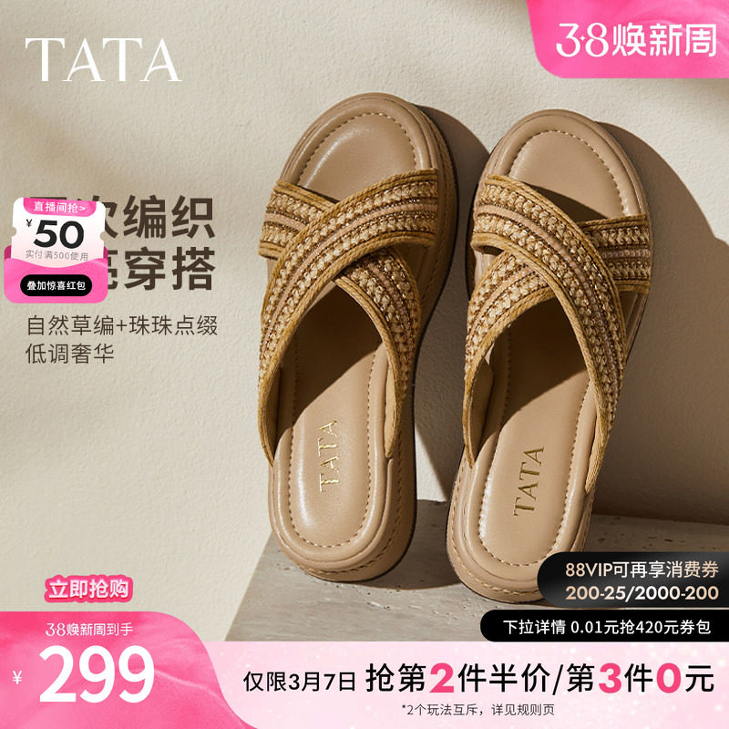 TATA他她女鞋夏厚底坡跟一字拖通勤外穿休闲沙滩露趾凉拖WM302BT5