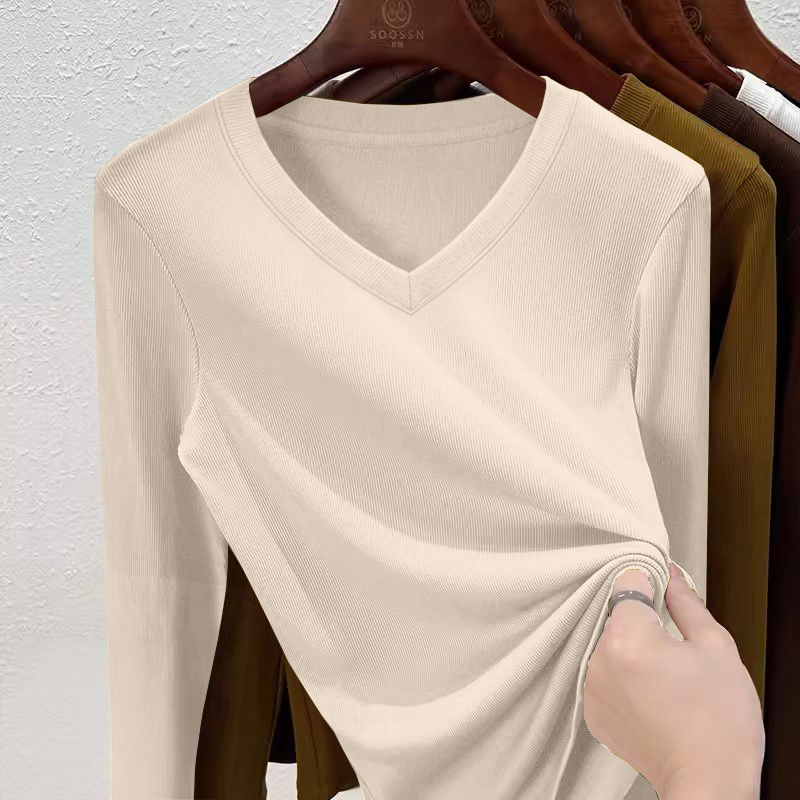 女士秋冬季大码V领螺纹长袖T恤女修身内搭外穿百搭打底衫上衣