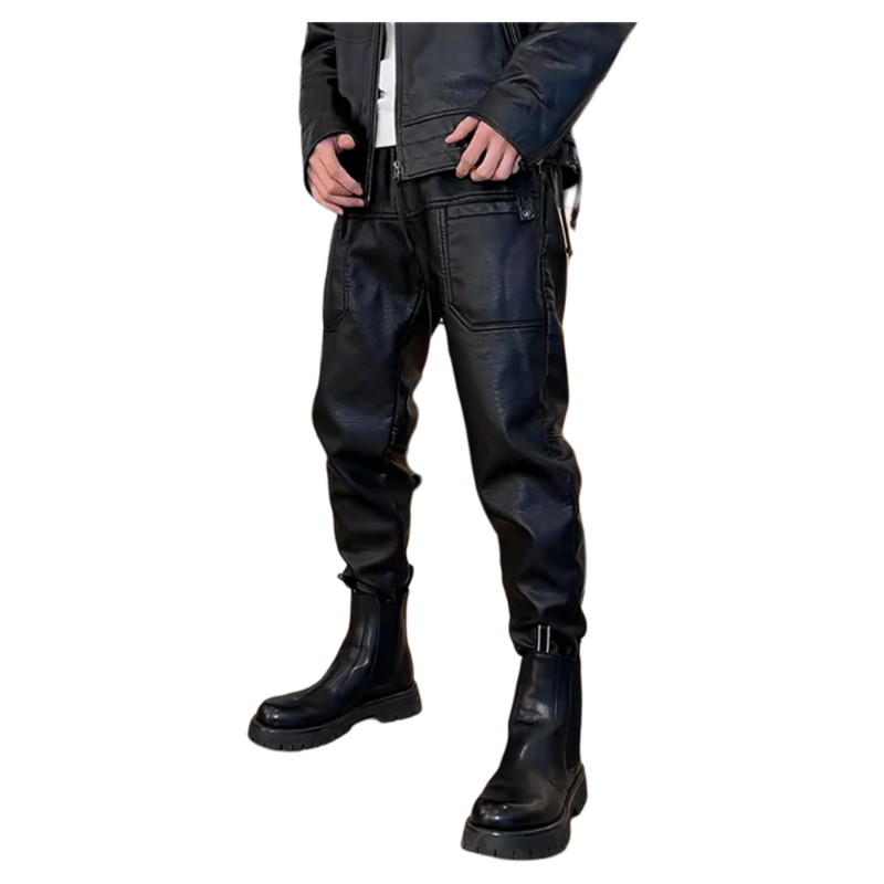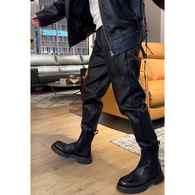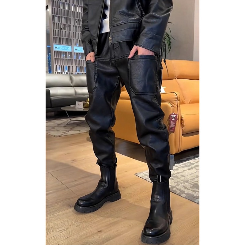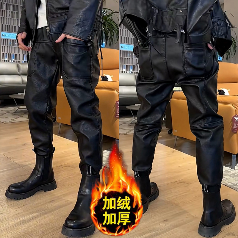 秋冬2026新款加绒六兜束脚皮裤男士束脚裤潮流防风防水小脚休闲裤