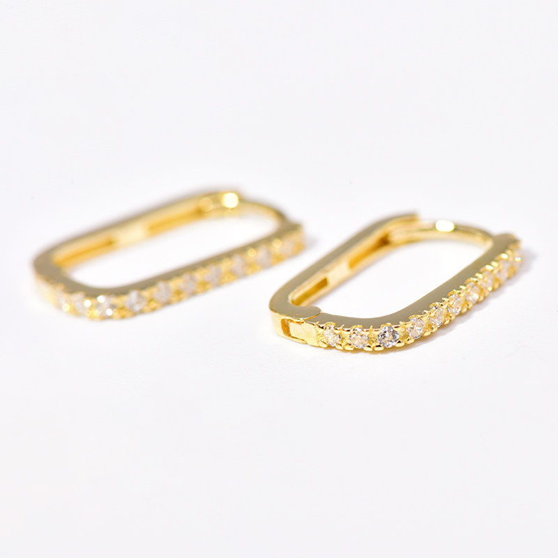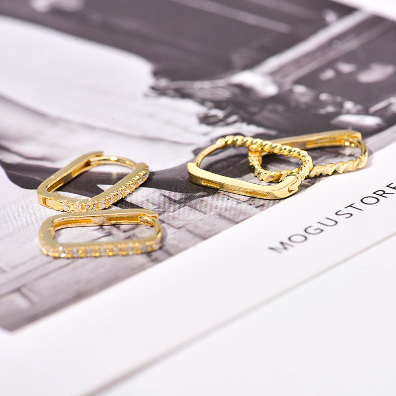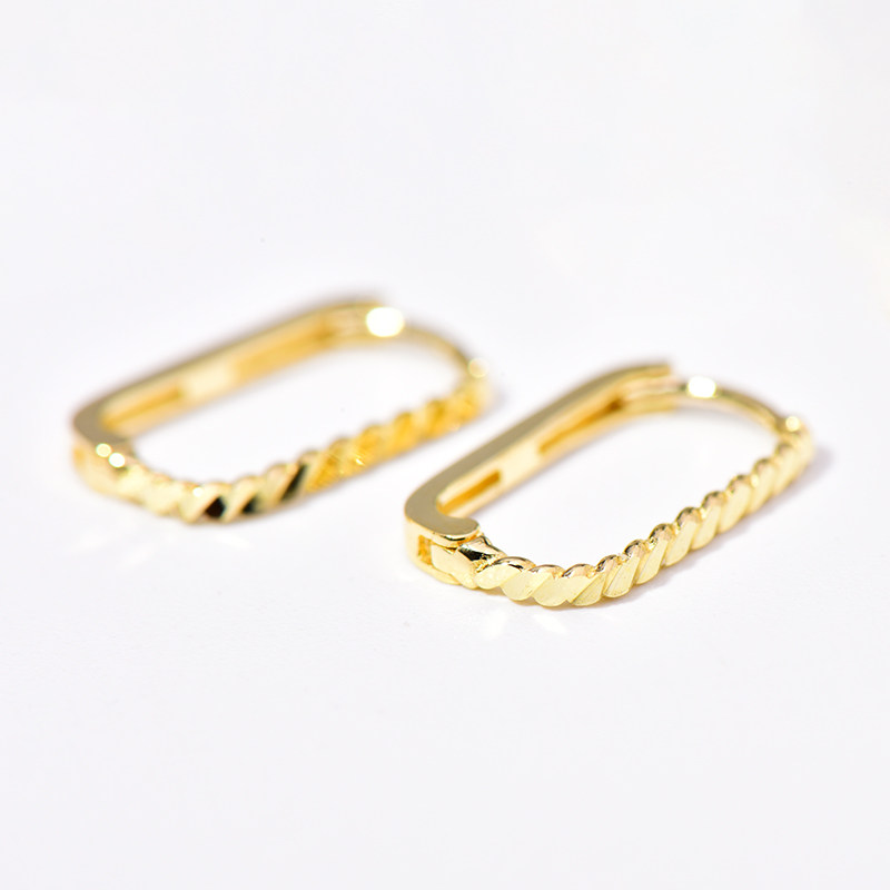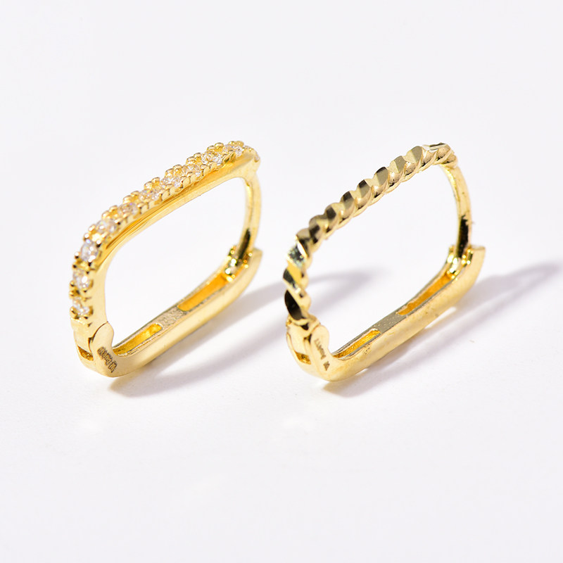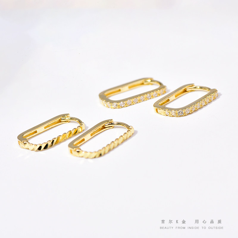 高级感首尔k金纯10k/14k金黄金首饰耳扣时尚几何方形麻花锆石耳环