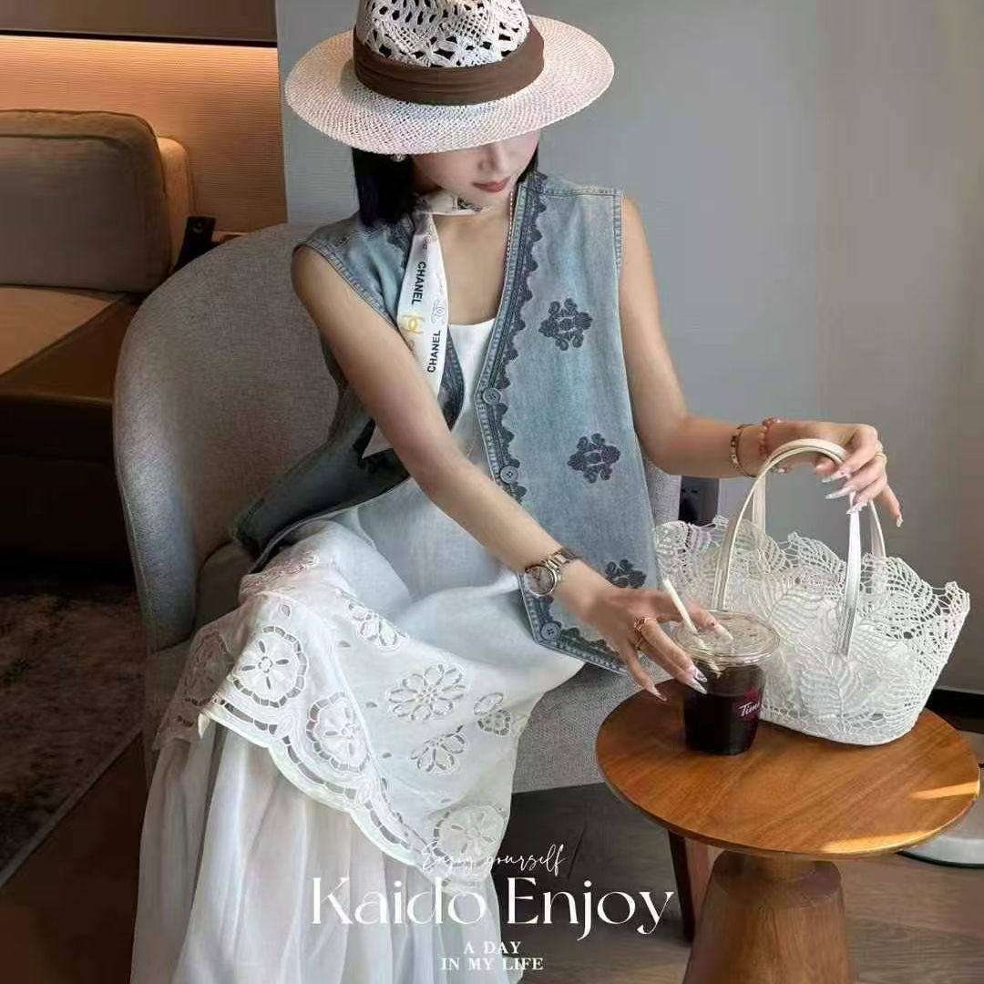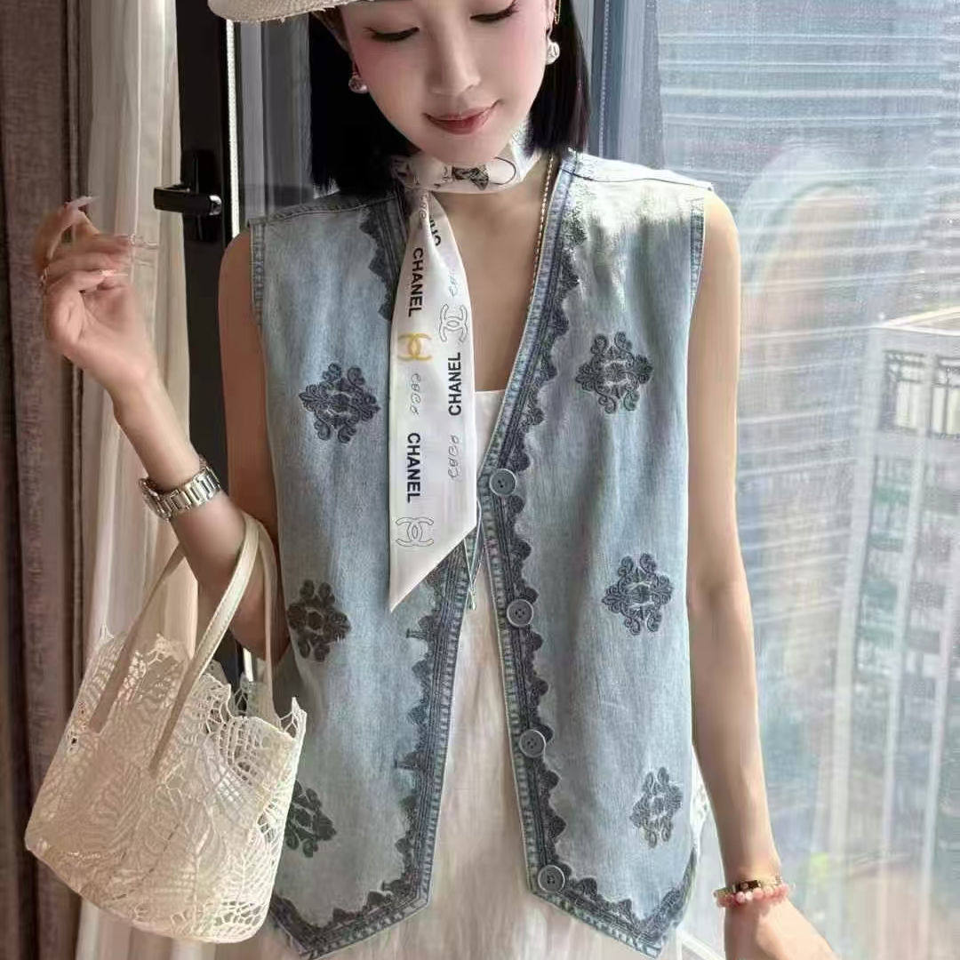 欧洲站高级感V领刺绣单排扣牛仔马夹女2025夏季新款时尚马甲外套