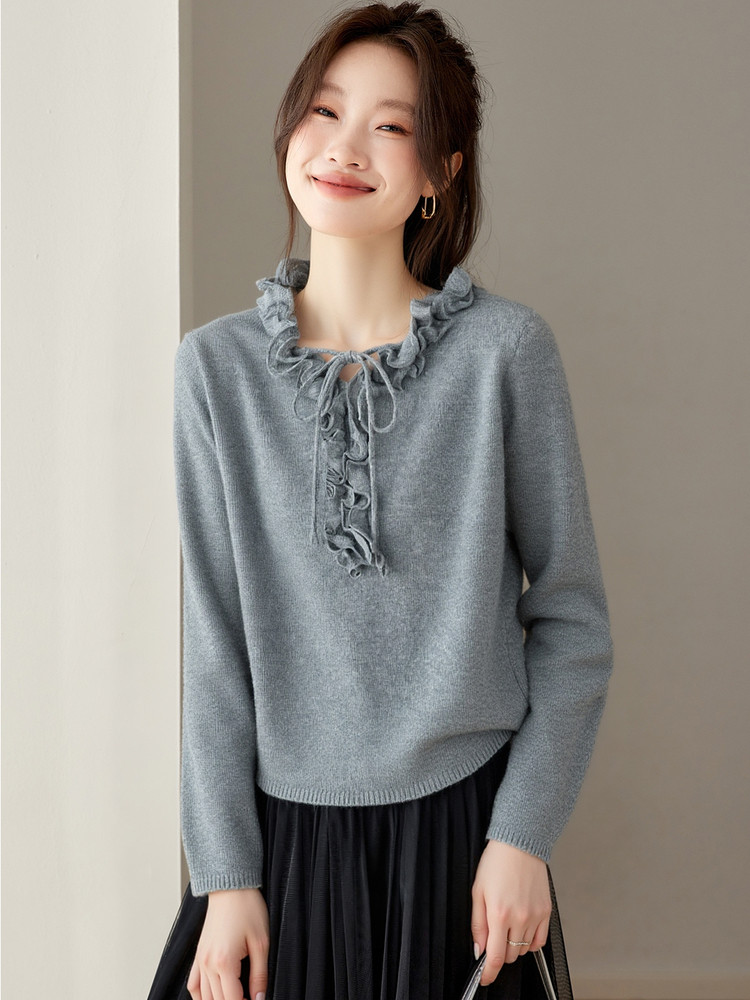 设计感木耳边系带针织衫女士短款秋装2025新款长袖打底衫上衣百搭
