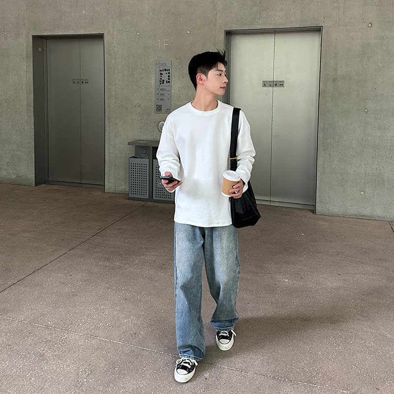 320g重磅白色圆领套头长袖T恤男生2026春秋季日系简约基础打底衫