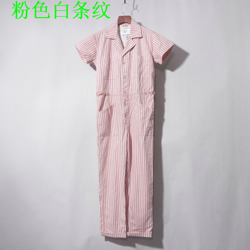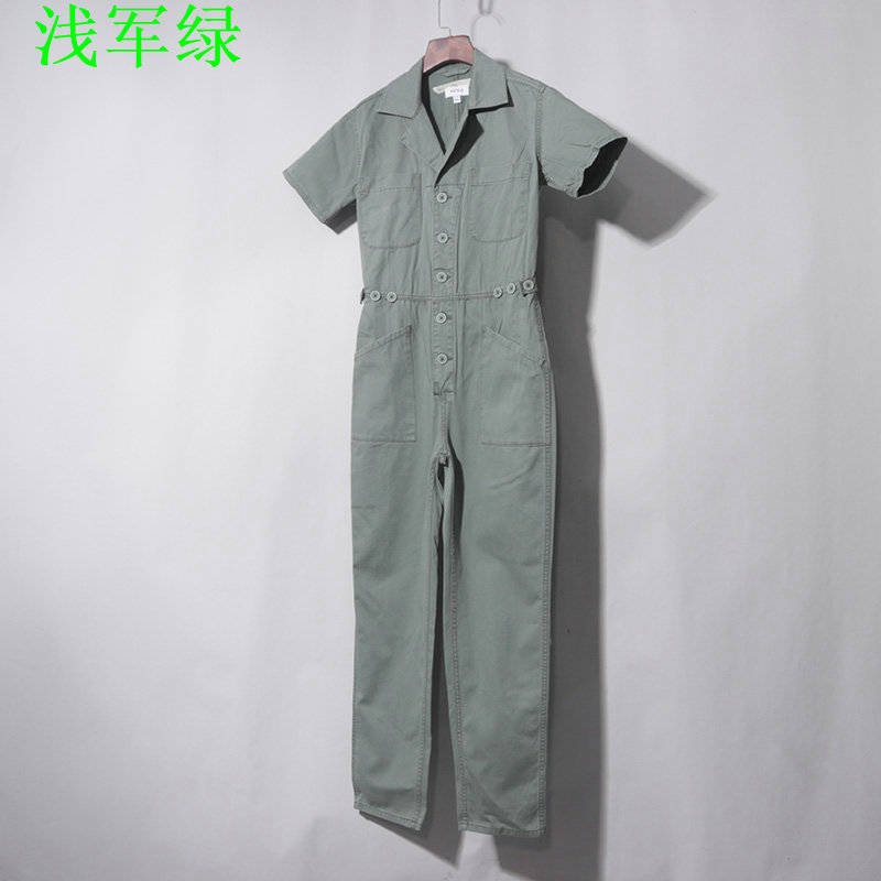 纯棉短袖连体长裤春夏牛仔连衣裤女工装薄款衬衫领收腰纽扣