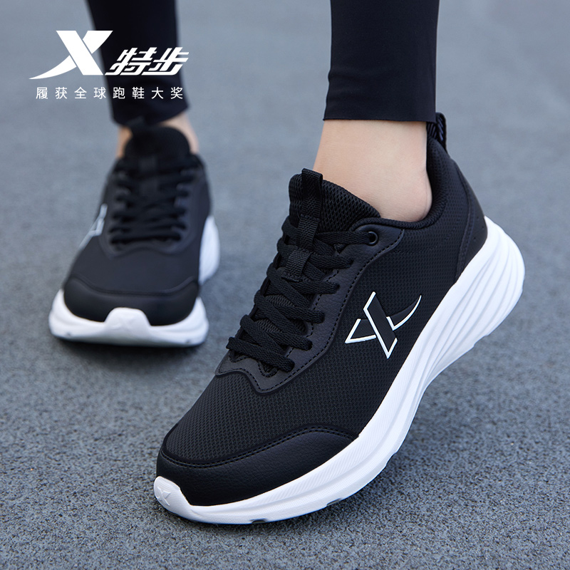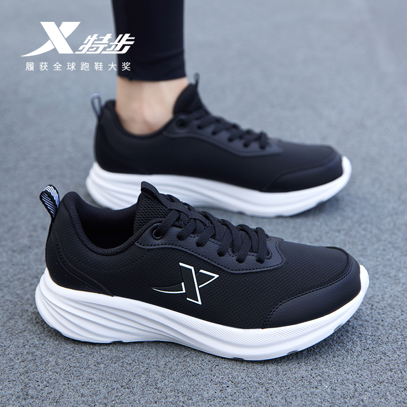特步女鞋2025新款轻便软底黑色运动鞋女款学生皮面防水全黑跑步鞋