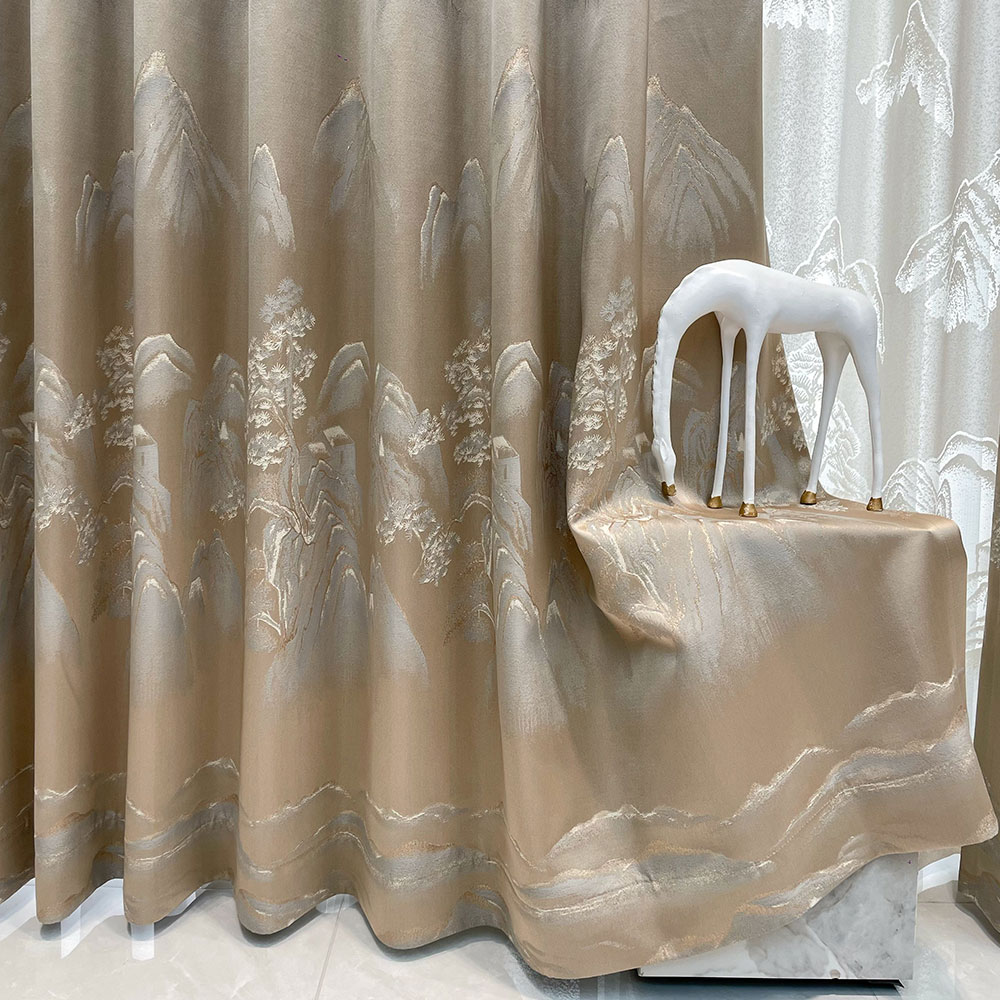 2025年新款遮光防晒轻奢新中式江山如画香槟咖高精密成品定制窗帘