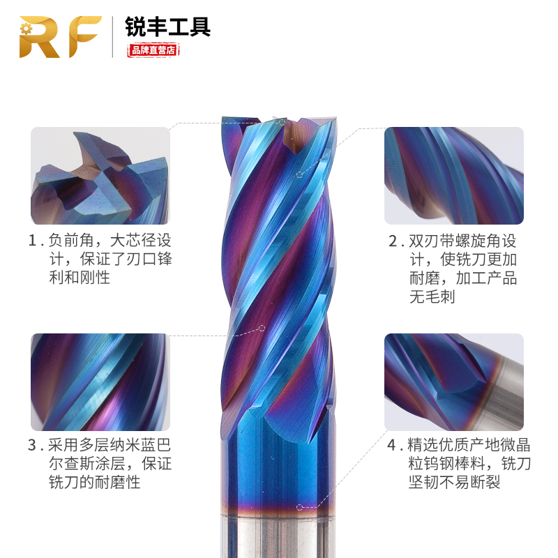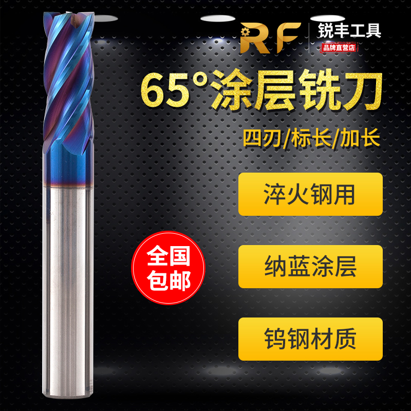 锐丰65度4刃蓝纳米涂层CNC数控钨钢立铣刀合金高硬淬火钢专用加长