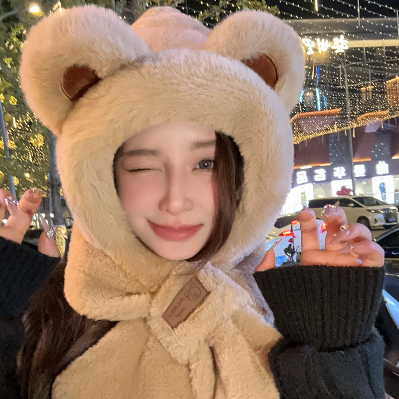 小熊帽子保暖围脖围巾一体连帽可爱女款2025秋冬季新款骑行加厚绒