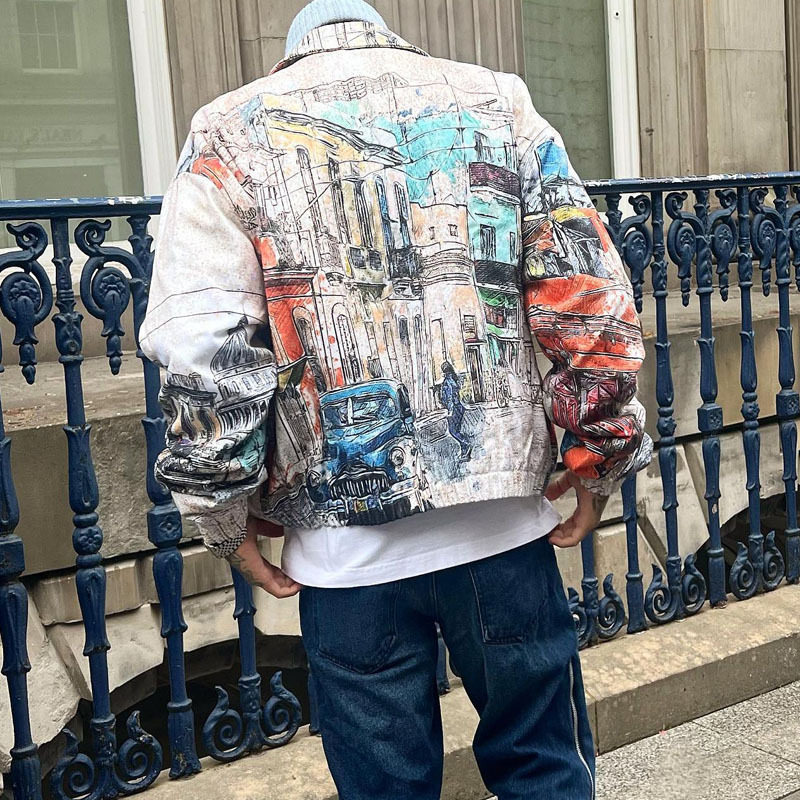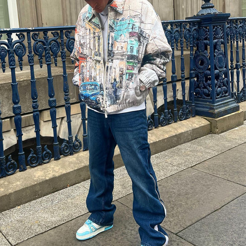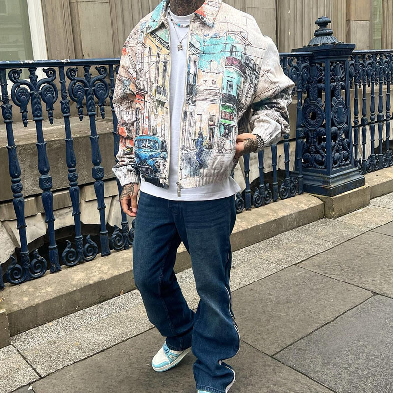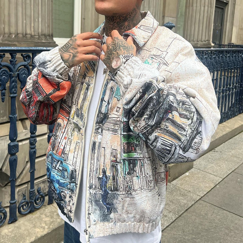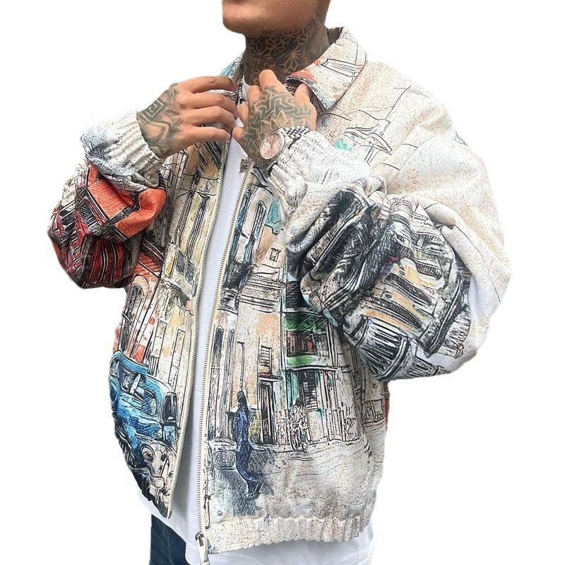 Trade menswear亚马逊新款翻领单排扣夹克宽松跨境潮牌涂鸦男外套