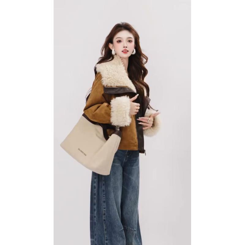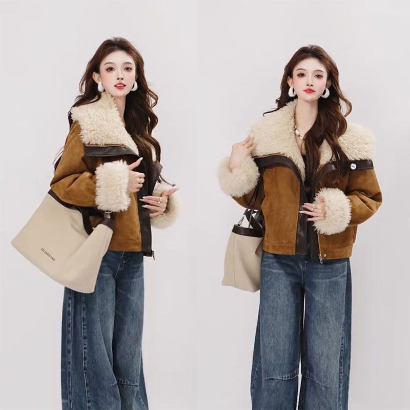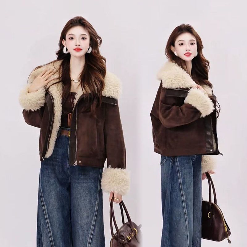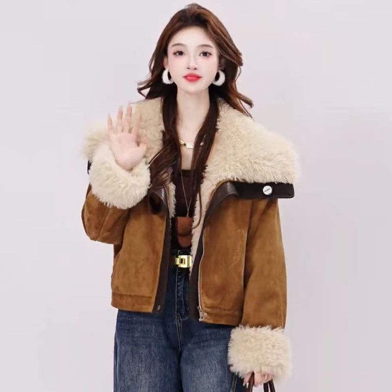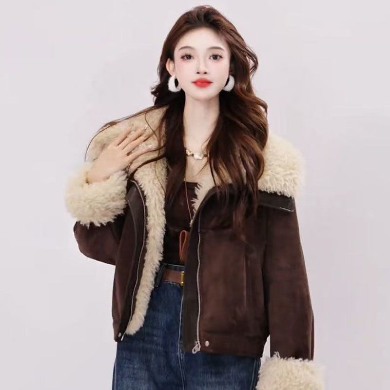 宽松型短款时尚极简风女士保暖秋冬加绒厚款皮衣